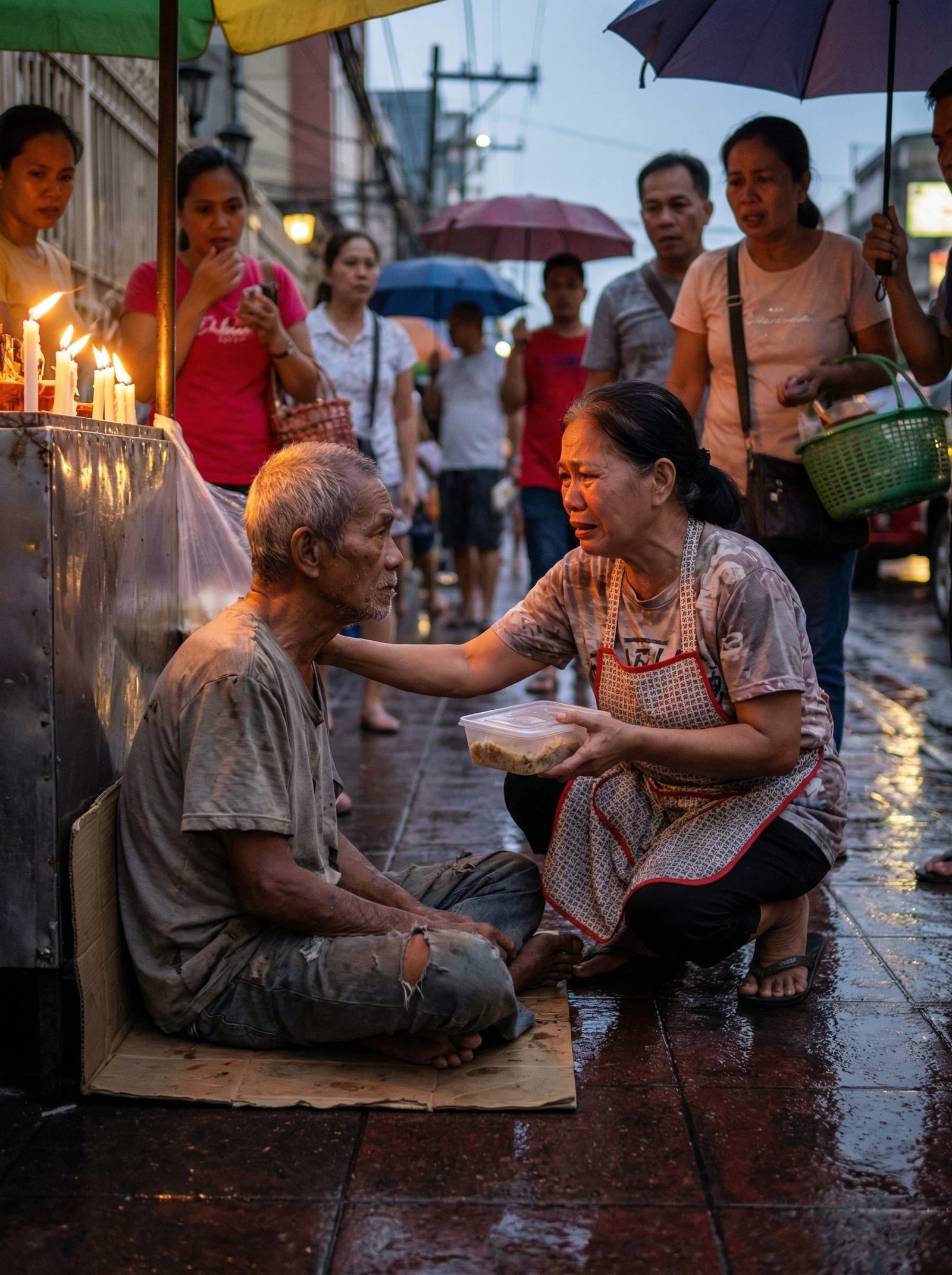 Makalipas ang ilang minuto, lumapit ang isang simpleng tinderang babae na nakasuot ng lumang duster at basang apron. Hawak niya ang isang plastic na lalagyan ng mainit na lugaw. Maingat siyang lumuhod sa tabi ng lalaki at tinakpan ito ng kalahati ng kanyang payong.