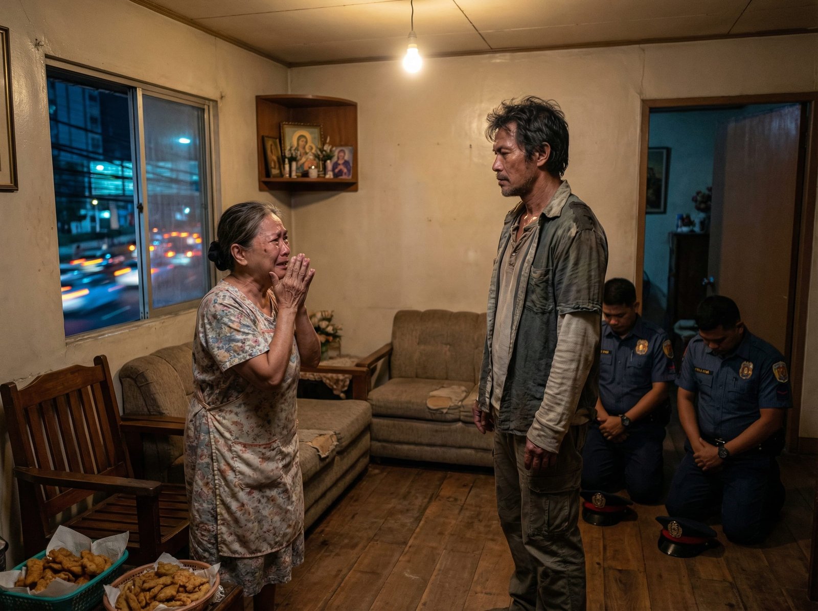 Sa gilid ng sala, naroon ang dalawang pulis na bumalik—hindi para manghuli, kundi para humingi ng tawad. Dahan-dahan silang lumapit kay Aling Rosa at kay Adrian.