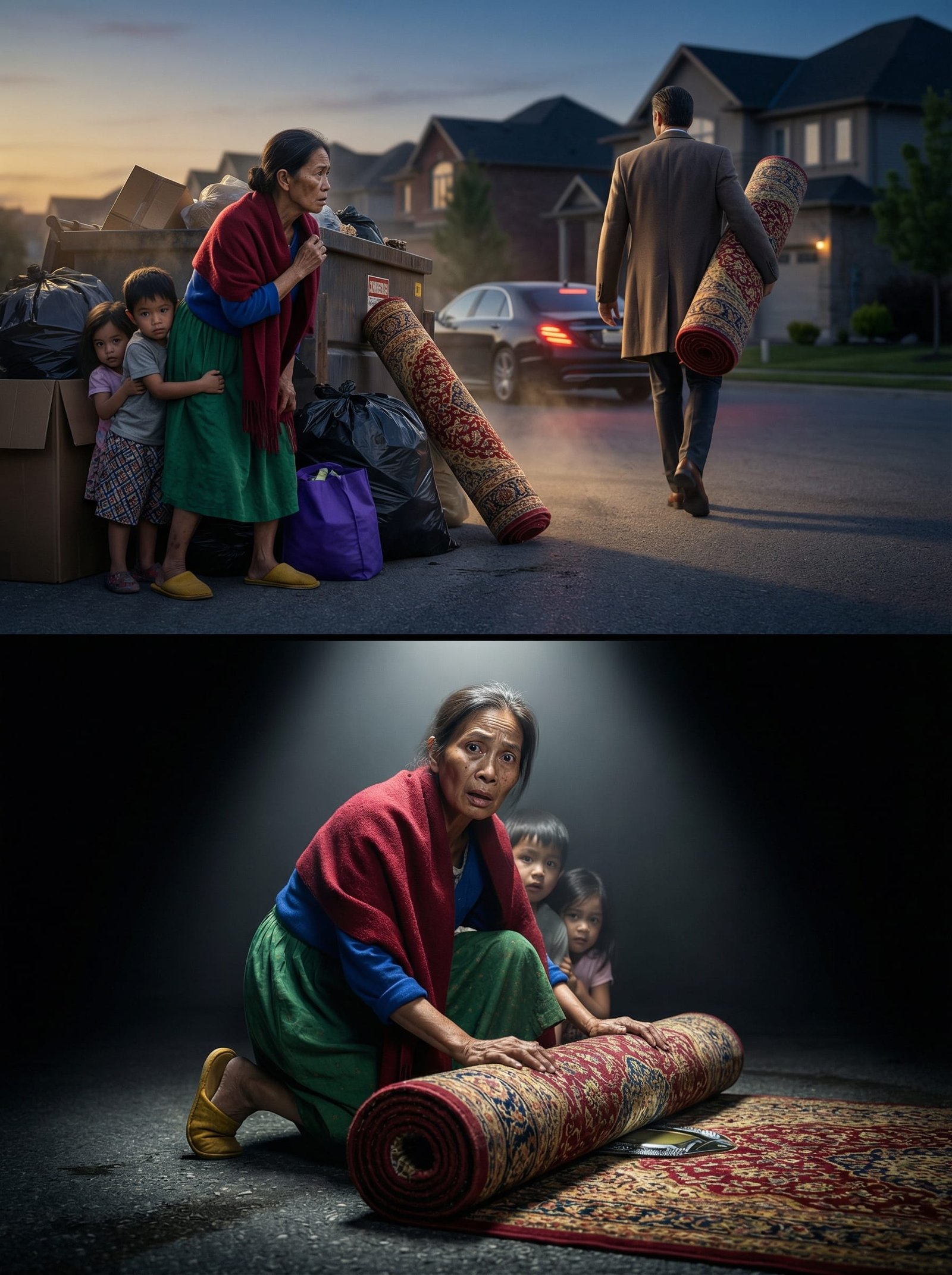 Sa gilid ng kalsada, may malaking dumpster na punong-puno ng black trash bags at kahon ng mga bagay na mukhang bago pa. Doon nila nakita ang isang itim na sedan na huminto. Bumaba ang isang lalaking naka-coat, maayos ang sapatos, at halatang galing sa bahay na may aircon at katahimikan. Sa balikat niya, may bitbit siyang marangyang alpombra—makapal, pulang may gintong desenyo, parang galing sa hotel o museum.