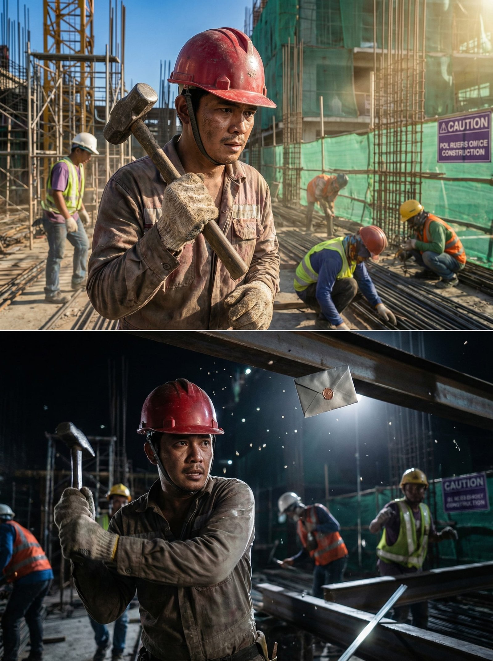 Sa taas, sa isang bahagi ng scaffolding, pinapalo niya ang wedge para maayos ang formworks. May dalawang worker na nagtutulungan, halatang gutom, halatang pagod. Sa baba, narinig niyang may nag-away tungkol sa overtime pay.