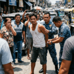 Sa likod ng salamin, may mga tao nang nakasilip. May umiiyak, may nagvi-video. Sa pintuan, nakatayo ang mga pulis, nakataas ang baril. Sa gilid, isang barangay tanod ang pilit kumakalma sa crowd.
