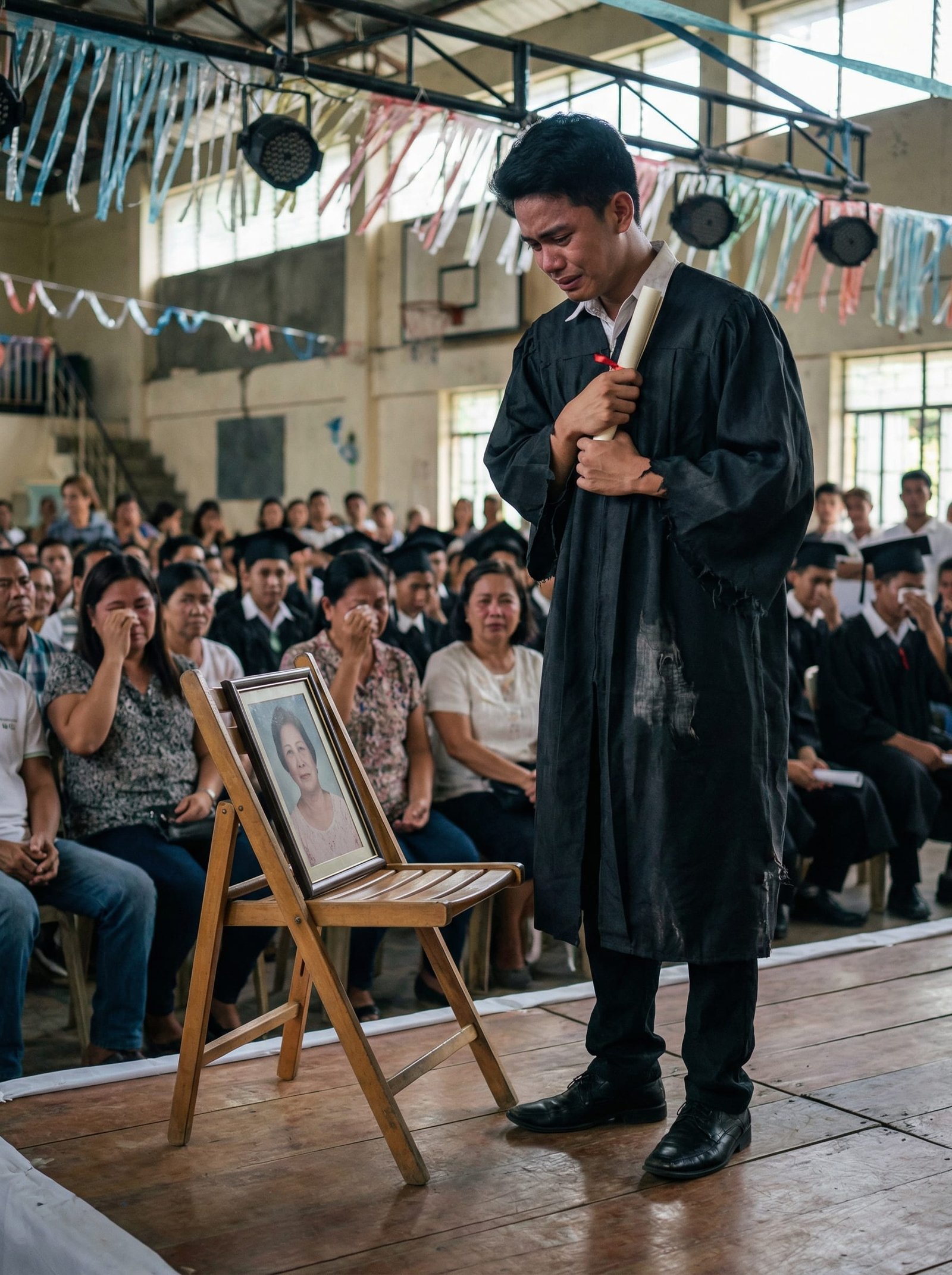 Sa harap ng napakaraming tao, tumingin siya sa bakanteng silyang nasa gilid ng entablado kung saan nakapatong ang lumang framed photo ng kanyang ina—isang simpleng larawan na pinayagan ng paaralan na ilagay roon bilang espesyal na kahilingan niya.