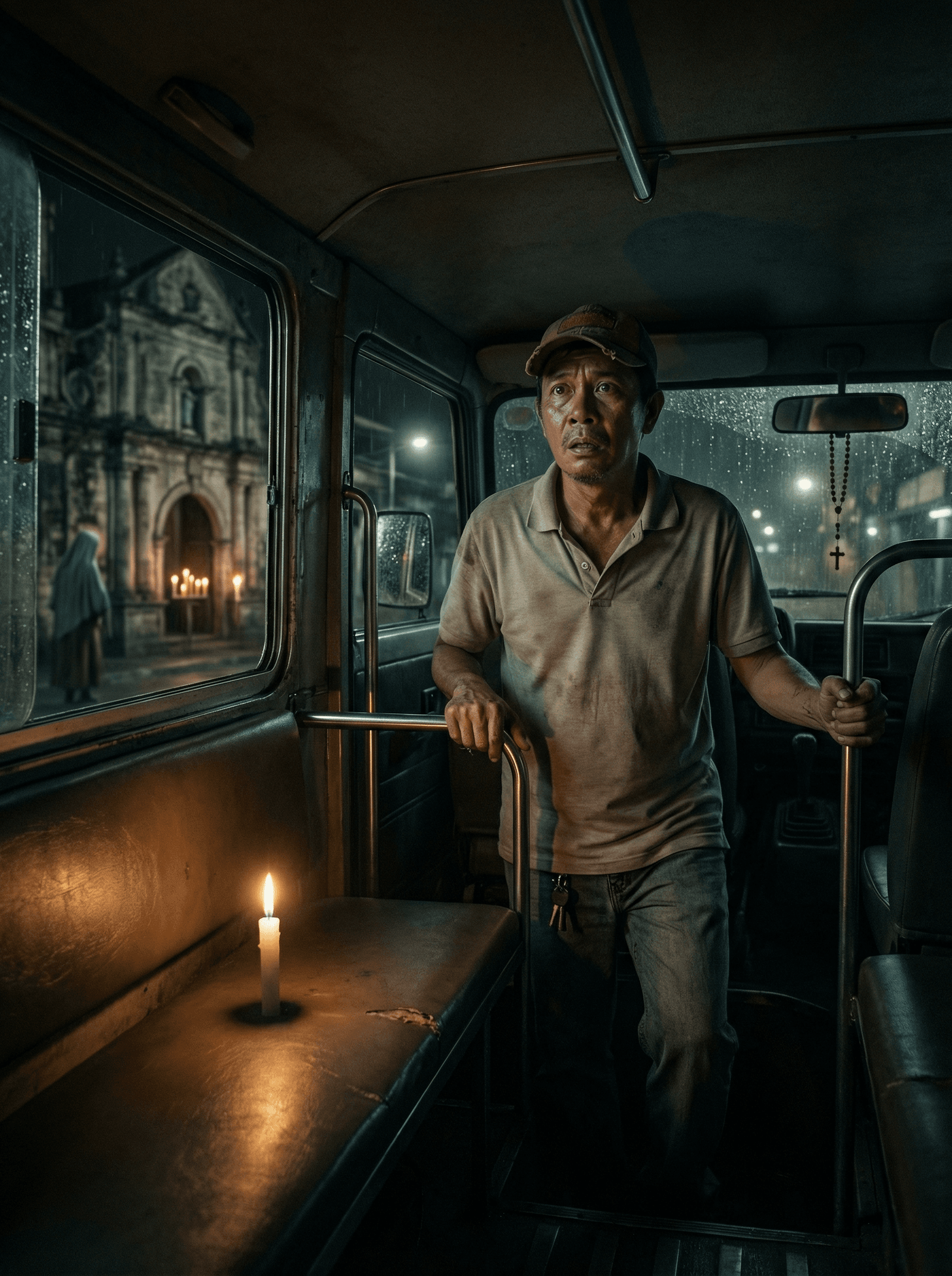 Minsan, pagkakuha niya sa kandila, may malamig na hangin pang dumadaan sa loob ng jeep kahit sarado ang karamihan ng bintana. At sa rearview mirror, pakiramdam niya’y may matang nakatingin mula sa hulihan—pero paglingon niya, puro bakanteng upuan lang.