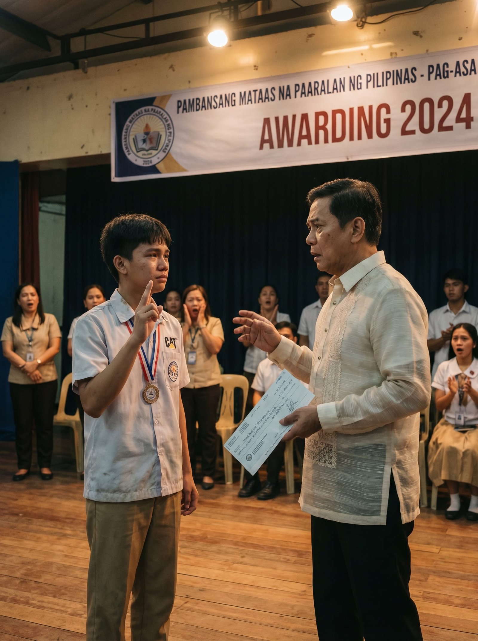 Punô ang covered court ng paaralan. Nasa harap ang mga guro, magulang, estudyante, at ilang lokal na opisyal. May palakpakan, may camera flash, may sigawan ng suporta mula sa mga kaklase. Sa gitna ng entablado, isa-isang tinatawag ang mga awardees habang suot ang kanilang malilinis ngunit simpleng uniporme.