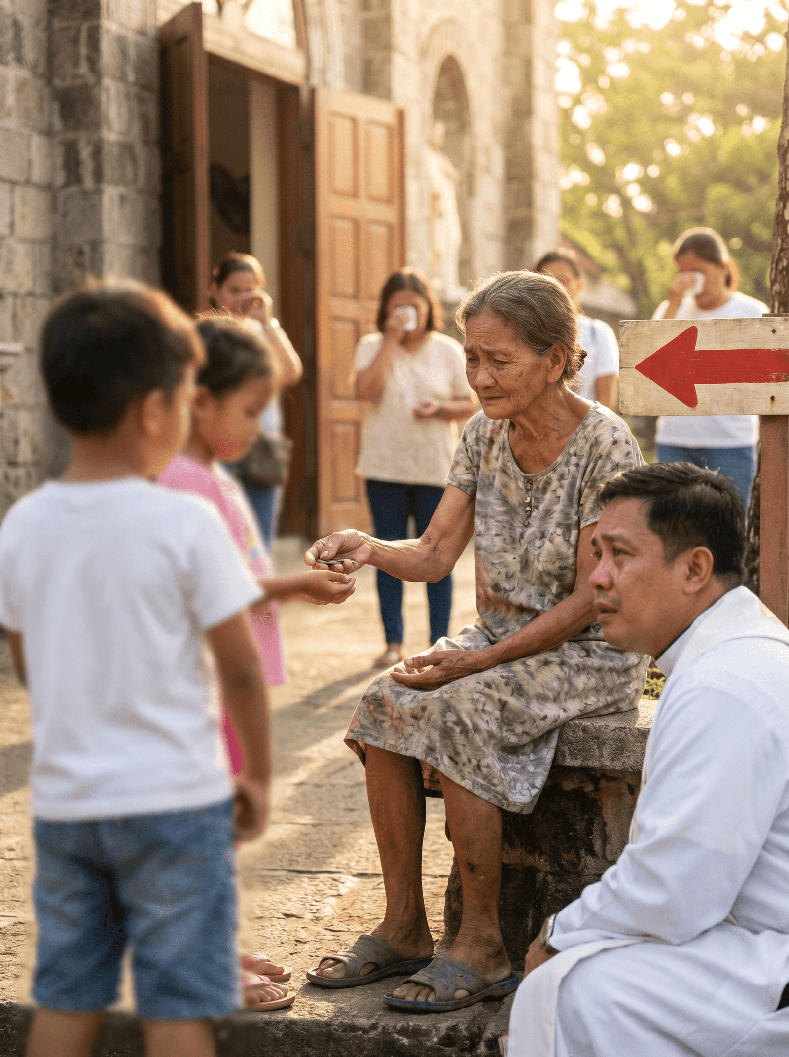 Isang Linggo ng hapon, pagkatapos ng misa, nakita mismo ni Fr. Mateo ang eksenang tumatak sa kanyang isip. May dalawang batang magkapatid na marurumi ang damit at halatang gutom. Lumapit ang mga ito sa matanda, tila nahihiyang magsalita. Hindi man niya kilala ang mga bata, agad na inabot ng babae ang natirang barya niya at saka ibinigay ang isang tinapay na dapat sana’y hapunan na niya.