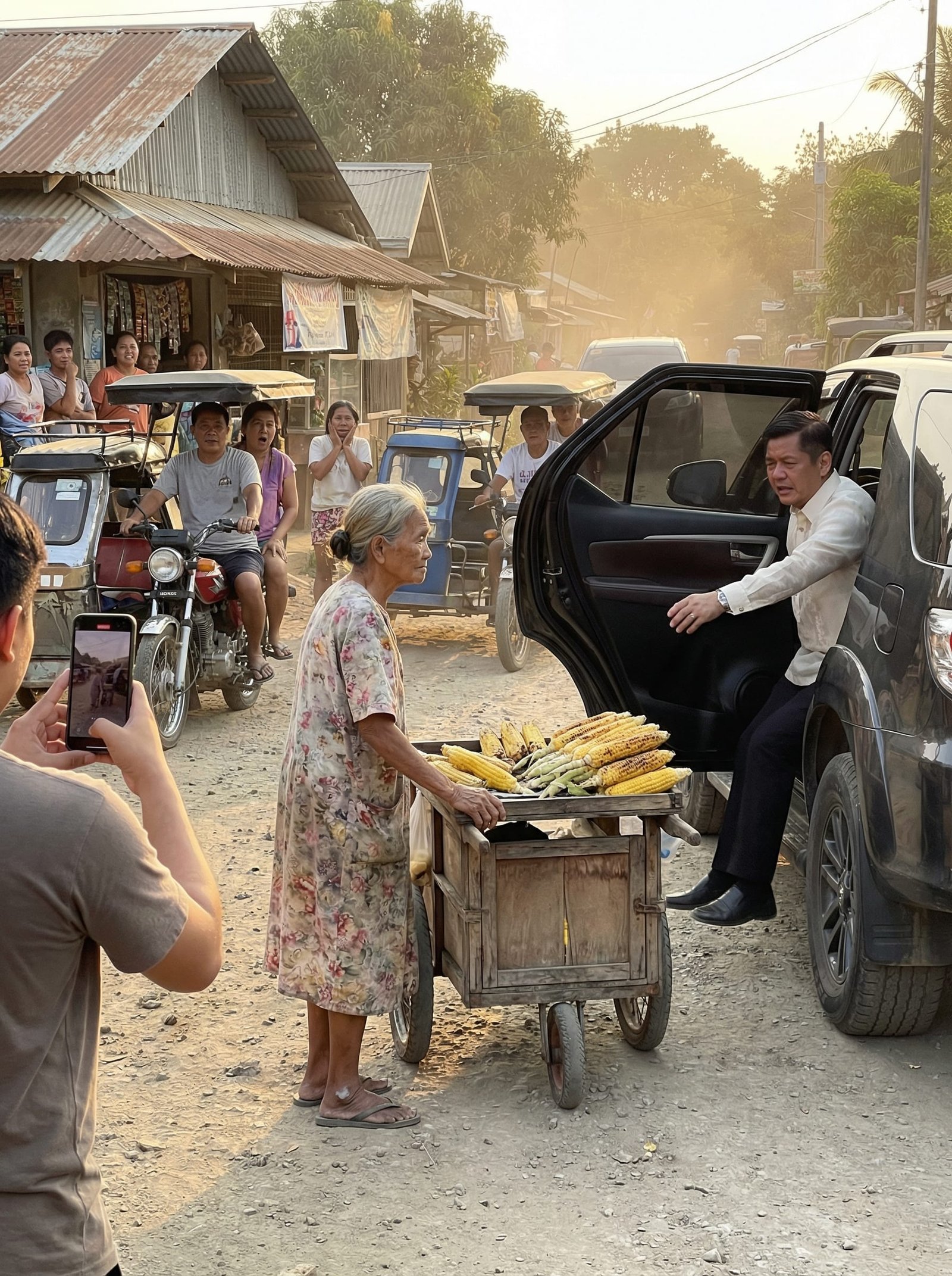 Nang oras ding iyon, biglang huminto sa tapat niya ang isang itim na SUV. Bumaba roon si Mayor Renato Villareal, isang kilalang pulitiko sa bayan. Napatingin ang mga tao. Ang iba’y napahinto sa pagmamaneho ng traysikel, ang iba nama’y lumabas pa mula sa mga tindahan para manood.