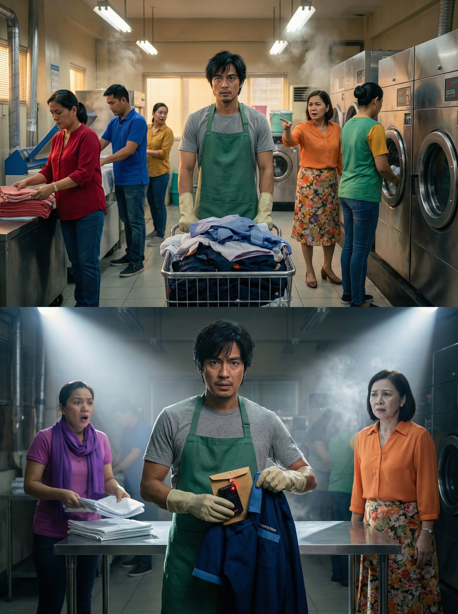 Nanlamig ang palad ni Miguel habang hawak ang USB. Parang biglang nawala ang init ng plantsa at umapaw ang lamig ng katotohanan. Tumingin siya sa paligid—si Jona abala sa pagtupi, si Arvin nakayuko sa ironing board, si Marites nasa kabilang mesa, at si Ma’am Lucy… nakatingin sa kanya.
