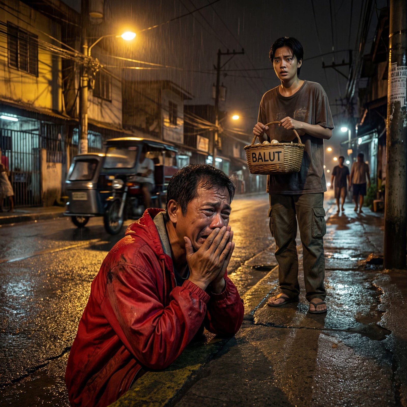 Pagliko ng tricycle sa isang eskinita, napatingin si Lorna sa isang batang nakatayo sa ilalim ng ilaw—payat, basang-basa, nakasuot ng kupas na tshirt at tsinelas. Hawak nito ang isang basket na may nakasulat na “BALUT”.