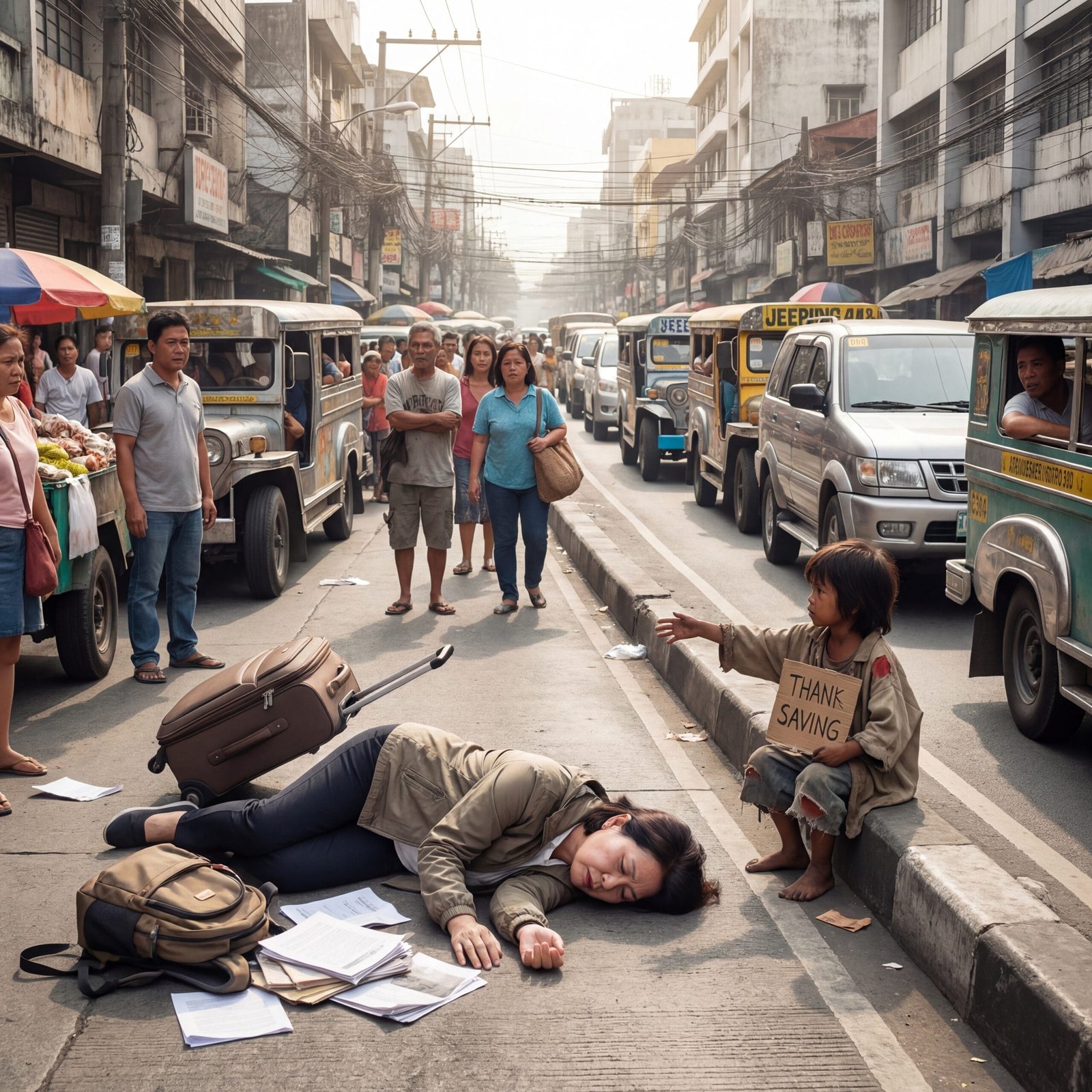 Pero bago siya makarating sa school, napadaan siya sa mataong kalsada—punong-puno ng jeep, bus, at nagmamadaling tao. Sa gitna ng usok at init, may batang nakaupo sa gutter, gusot ang damit, madumi ang paa, at may karton sa kamay.
