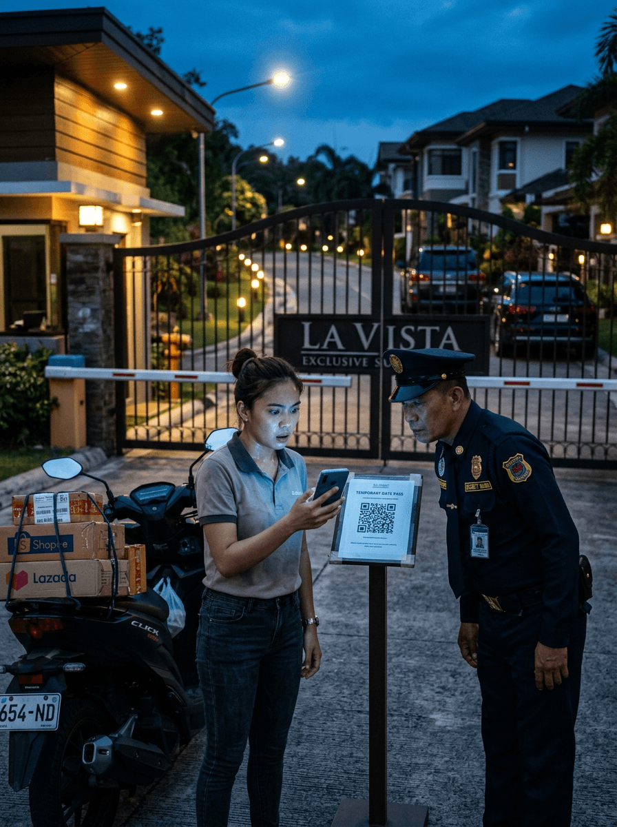 Inabot ni Mia ang printed paper na binigay ng courier app: TEMPORARY GATE PASS na may QR code. “Sir, delivery po. Unit 12… Block C. Pangalan po—” tiningnan niya ang resibo, “—‘L. Reyes’.”
