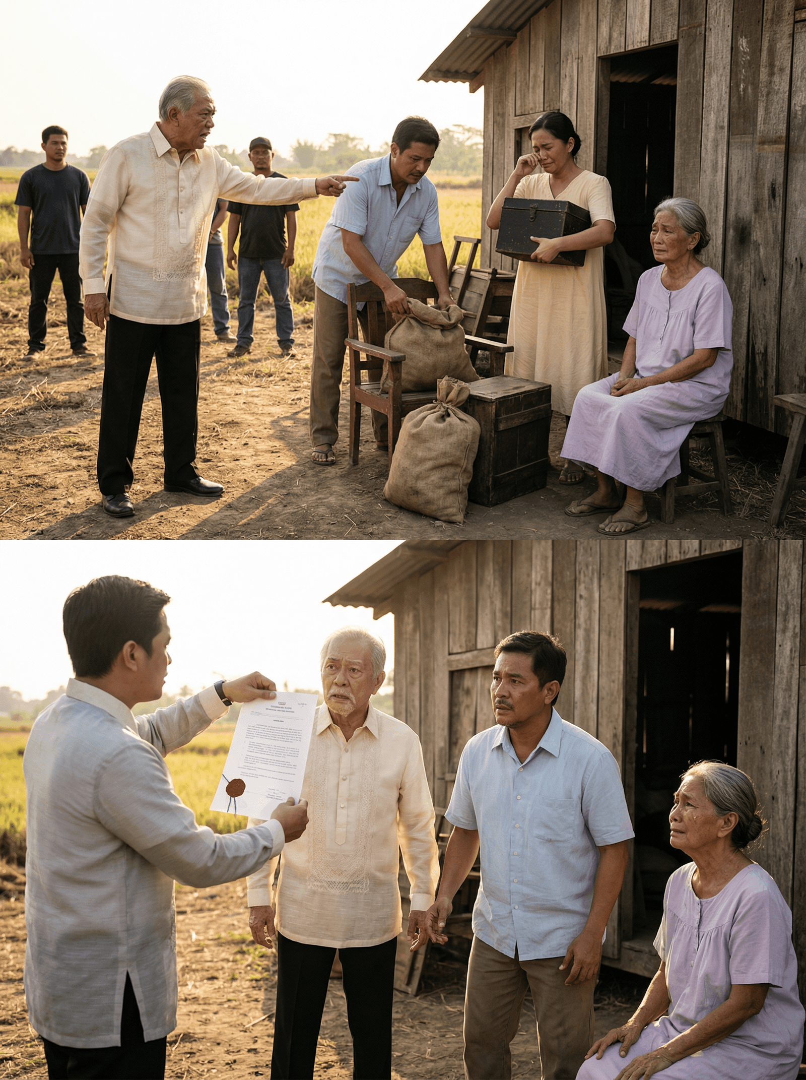 Halos kasabay ng unang sikat ng araw ang pagdating ng sasakyan ni Don Severino Villarta sa gilid ng bukirin. Kilala siya sa bayan bilang isang makapangyarihang panginoong-lupa—matanda na, mayaman, at sanay na lahat ay sumusunod sa isang turo lamang ng kanyang daliri. Sa likod niya ay dalawang tauhan at isang tagasulat na may hawak na sobre. Sa harap nila ay ang lumang bahay na kahoy nina Aling Pacing at ng anak niyang si Ruben—bahay na halos siyamnapu’t siyam na taon nang kinikilalang tahanan ng kanilang pamilya.