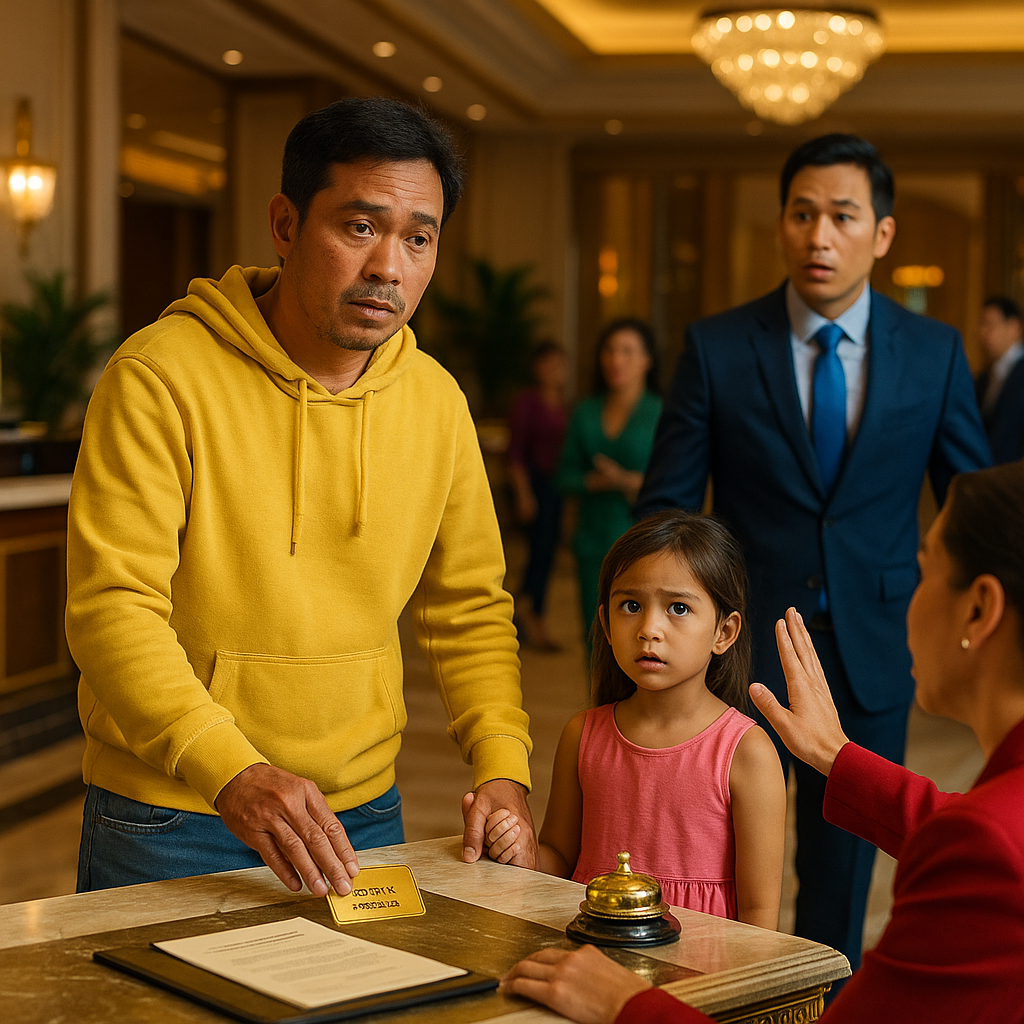 Alas-siyete ng gabi, kumikintab ang marmol ng Grand Aurelia Hotel habang parang alon ang pagpasok at paglabas ng mga bisita; sa gitna ng vestibule, pumasok ang lalaking naka-dilaw na hoodie at kupas na maong, may hawak na maliit na kamay ng batang babae na may kulay-rosas na bestida at kapirasong plush toy sa braso; hila-hila rin niya ang lumang backpack at isang duffel bag na halatang pinagtagni-tagni na ng panahon. “Good evening,” bati ng front desk agent na si Kaye, pero nabura agad ang ngiti nang makita ang suot ng lalaki. “Sir, for walk-in guests po, may dress code tayo at fully booked na rin.” Maingat na inabot ng lalaki ang isang card na kulay ginto na ang ukit ay “PRIORITY ACCESS // AURELIA.” “Reservation under Daniel Rivas,” mahinahon niyang sabi, pilit na hindi pinapansin ang kumukulong kaba sa dibdib; nakatingala lang ang anak niyang si Lia, kinakapa ang palad ng tatay na parang sinisigurong hindi ito bibitaw. “Sir,” singit ng supervisor na si Paolo na bagong palit at sintigas ng kuwintas ang kurbata, “kahit anong card pa ‘yan, wala po tayong available. Peak night. At… pasensiya na po pero kailangan ng valid credit card on file—hindi kami tumatanggap ng cash-only sa ganitong klaseng booking.” “Meron akong card,” sagot ni Daniel at inilabas ang payat na wallet; mabilis na kinuha ito ni Paolo, sinipat, saka marahang itinulak pabalik na parang marumi. “Sir, expired ‘to.” Tumikhim si Kaye at ibinaba ang kamay na parang humahadlang. “Baka puwedeng bumalik na lang po kayo bukas, may hostel sa kanto, sir. For your… budget.” Napasinghap ang ilang nasa pila; may isang mamahaling gown na umikot ng tingin at napangisi—ang uri ng ngiting mas sugat pa sa salita. Kumirot ang mukha ni Daniel pero hindi siya gumanti. “Kakagaling lang namin sa bus,” aniya, “may lagnat si Lia kanina sa byahe. Kailangan lang namin ng kwarto ngayong gabi. May reservation ako—hindi ako walk-in.”