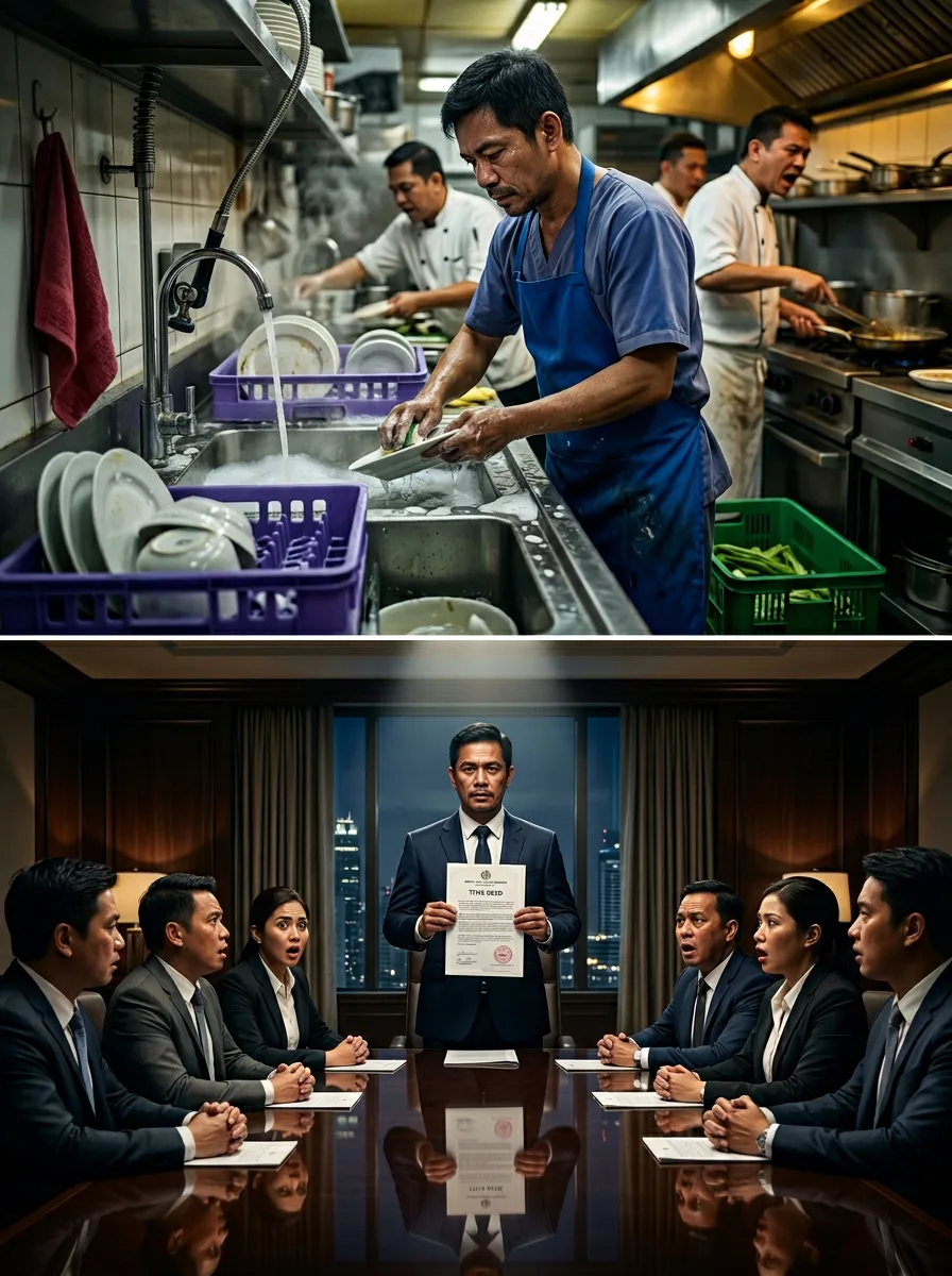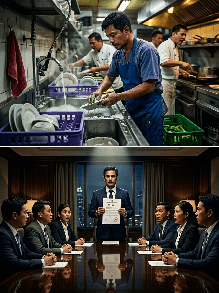 Sa gabing iyon, may meeting ang board of directors. Si Gelo, naka-uniporme pa rin ng dishwasher, pero sa ilalim ng apron niya, may suot siyang maayos na polo—parang paalala sa sarili: hindi habang-buhay siyang nasa likod.