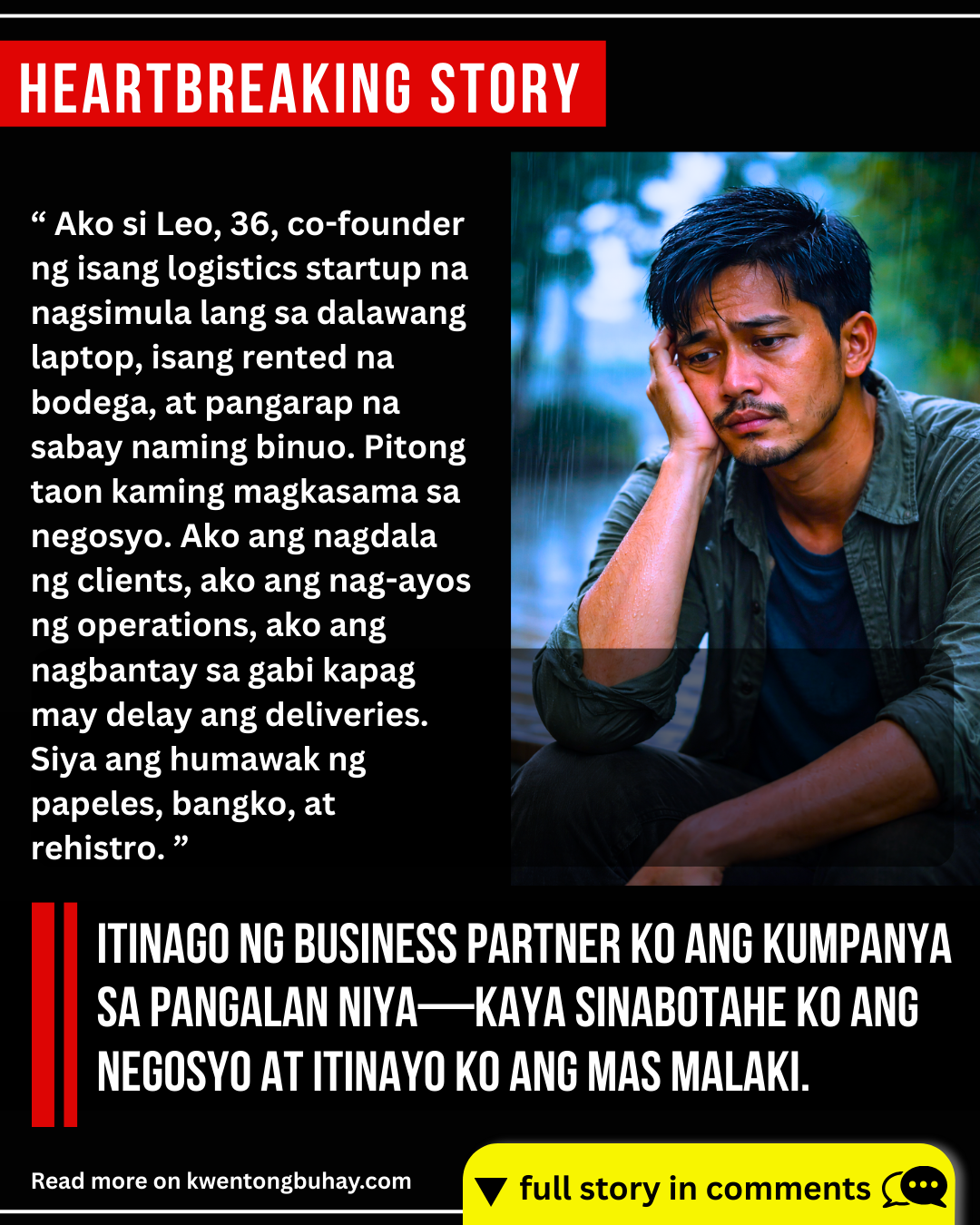 Nalaman ko ang lahat sa isang simpleng email na hindi dapat napunta sa akin. Forwarded lang, walang paliwanag, may attachment na akala nila hindi ko bubuksan. Certificate of Registration. Pangalan ng kumpanya na binuo namin mula sa wala. At sa ilalim ng “Owner” at “Authorized Signatory,” iisa lang ang nakalagay—siya. Wala ang pangalan ko. Parang binuhusan ako ng malamig na tubig. Ako si Leo, 36, co-founder ng isang logistics startup na nagsimula lang sa dalawang laptop, isang rented na bodega, at pangarap na sabay naming binuo. Pitong taon kaming magkasama sa negosyo. Ako ang nagdala ng clients, ako ang nag-ayos ng operations, ako ang nagbantay sa gabi kapag may delay ang deliveries. Siya ang humawak ng papeles, bangko, at rehistro. Sabi niya, mas madali raw kung iisa lang ang hahawak. Nagtiwala ako. Mali. Unti-unti kong naalala ang mga senyales na binalewala ko—ang pagiging defensive niya kapag nagtatanong ako tungkol sa taxes, ang biglang pagbabago ng tono kapag humihingi ako ng financial report, ang mga meeting na hindi na niya ako ini-invite. Tahimik akong nagmasid. Hindi ako nagalit. Hindi ako nag-confront. Dahil kapag maaga kang umalma, maaga ka ring pinapatalsik sa sarili mong laban.