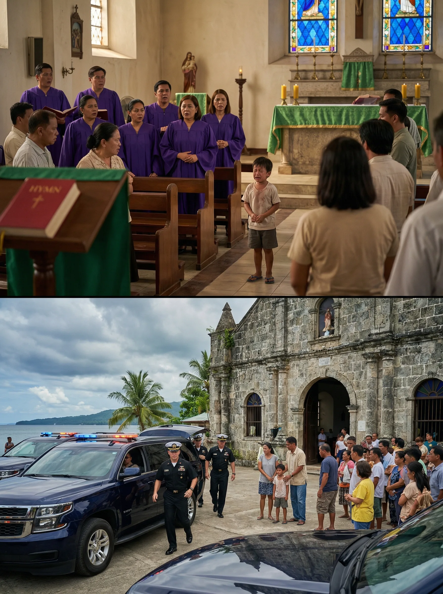 Binuksan ang malaking pinto ng simbahan. Bumungad ang liwanag at ang hangin ng dagat. At doon, sa bakuran, nakahilera ang ilang itim na SUV at isang van. May mga lalaking naka-uniform na may insignia, may puting cap, at maayos ang tindig—mga taong sanay maglakad na parang may dala-dalang bigat ng mundo.