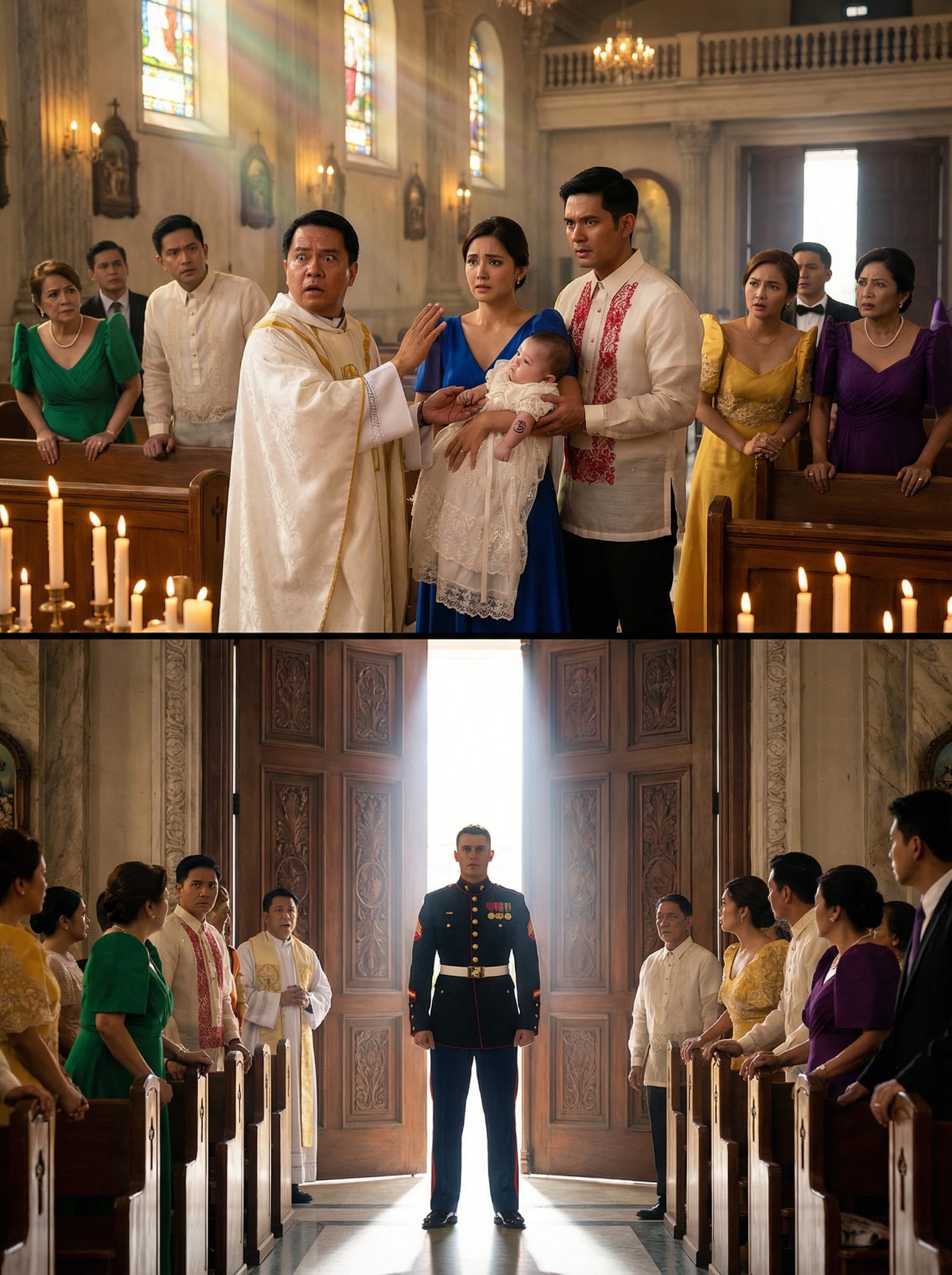 Lumabas si Marco sa gitna ng simbahan, dahan-dahan, walang armas, pero matatag ang tindig. Sa likod niya, si Bianca, bitbit si Baby Lucas, at si Father Ernesto na hawak ang krus. Ang mga bisita, tahimik na tahimik—parang lahat nagdadasal sa iisang dibdib.