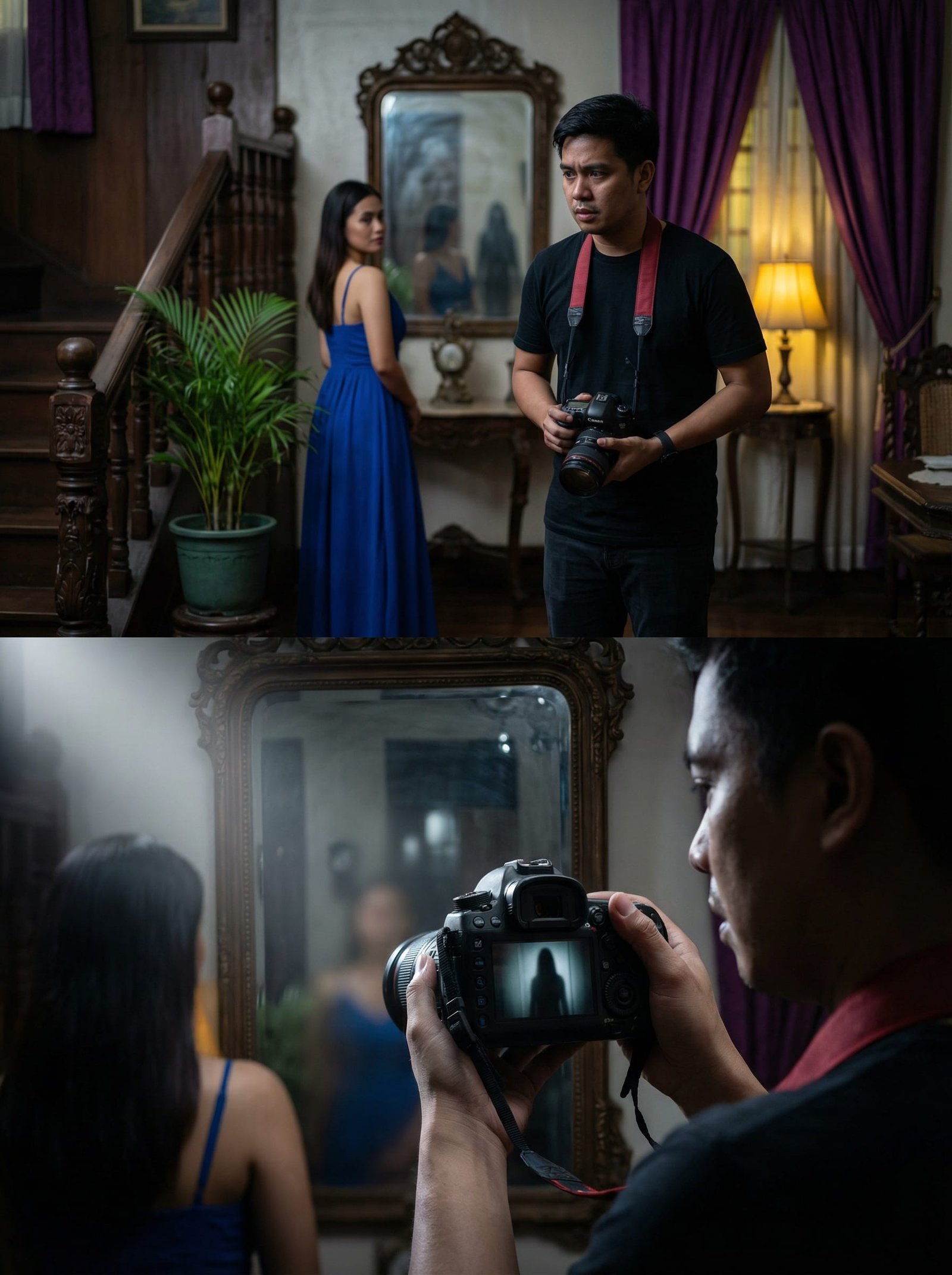 Habang tinitingnan niya ang preview, napansin niya sa salamin ang repleksyon ng likod ni Selena. Normal sana—kaso may anino na nakatayo sa likod niya sa repleksyon. Mahaba ang buhok, nakasuot ng parang lumang damit. Pero paglingon ni Marco sa aktwal na likod ni Selena—wala.