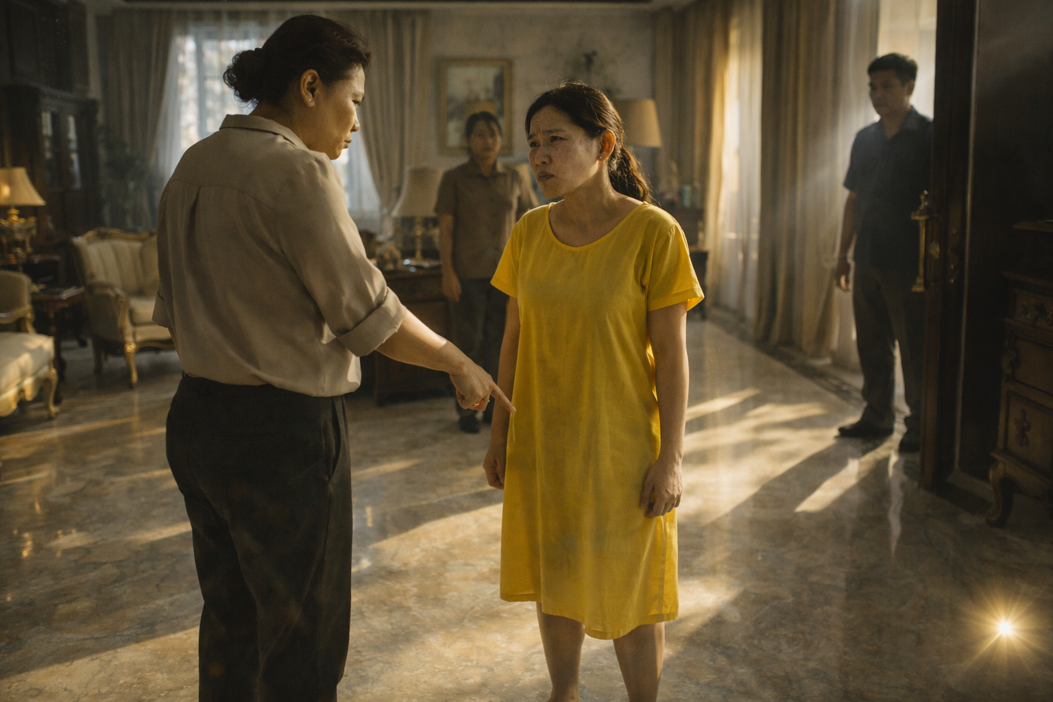 Sa gitna ng lahat ng iyon, nakatayo si NENA—kasambahay na nakasuot ng lumang dilaw na damit. Wala siyang sapatos. Nakayapak siya, nangingitim ang talampakan sa kakalakad sa likod-bahay at kusina. Hawak niya ang basahan, nanginginig ang kamay. Sa dibdib niya, parang may bato.
