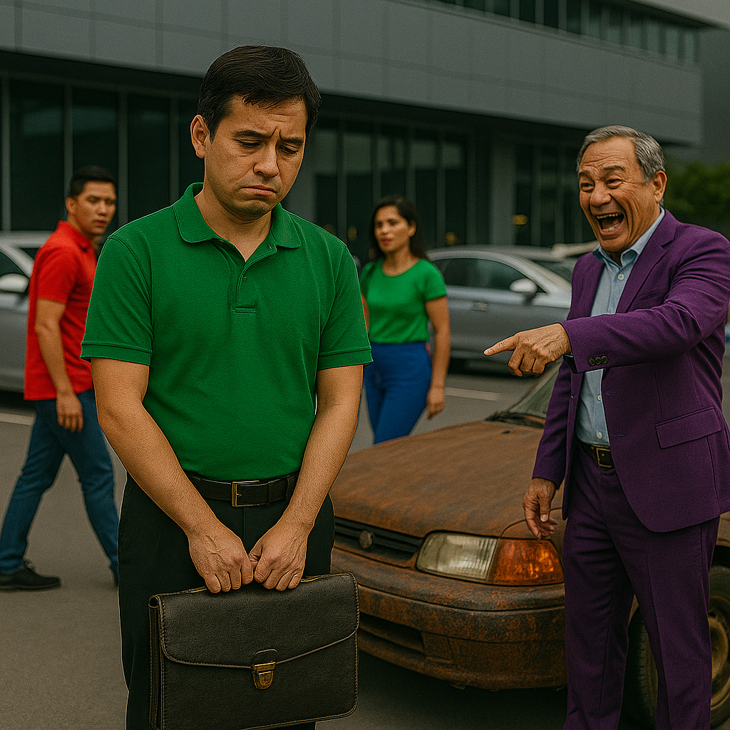 Maagang umaga sa parking lot ng modernong gusali, makulimlim ang langit at malamig ang hangin mula sa mga salaming bintana na parang mata ng higanteng korporasyon. Nakatayo si Nestor, suot ang berdeng polo na plantsado ngunit may kupas na laylayan, mahigpit na yakap ang lumang itim na briefcase na minana pa niya sa kanyang ama. Sa tabi niya, tila monumento ng kahihiyan, ang kanyang sasakyan—isang kalawangin at kupas na sedan, singkwento ng taon ang pintura, may bitak sa bumper at ilaw na parang laging iiyak. Sa di kalayuan, lumapit ang matandang boss na si Mr. Vega, naka-lilang suit na kumikislap sa liwanag, at sabay turo sa kotse ni Nestor—tawanan ang sumabog, mas malakas pa sa busina ng mga papasok na kotse.