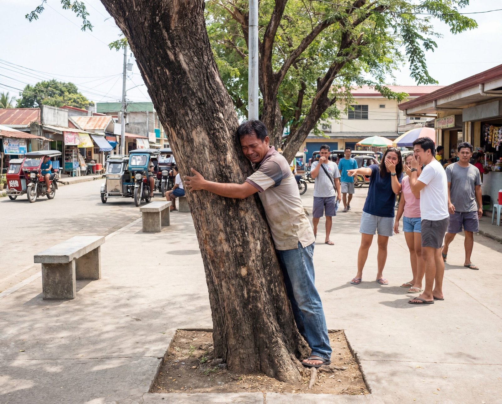 Pero hindi gumagalaw si Tomas. Nakadikit ang pisngi niya sa magaspang na balat ng puno na parang doon lang siya humihinga. Paminsan-minsan, dumidiin ang palad niya, tila may hinahanap na pulso sa kahoy. Sa likod, may dumaraan na tricycle, may nagkukumpulan sa talipapa, may mga estudyanteng pauwi—at lahat, may komentong pahamak.