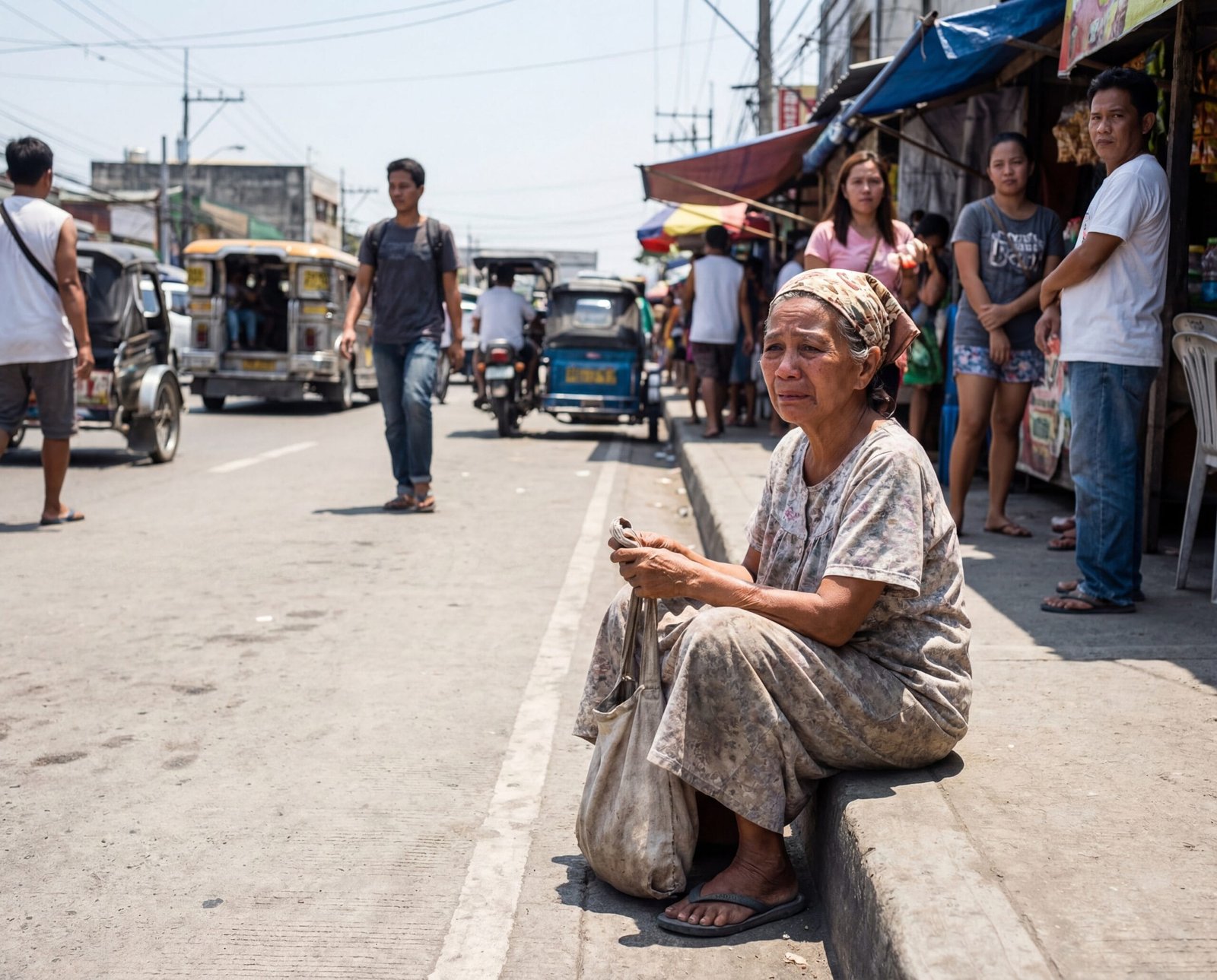 Mainit ang araw, at ang kalsada sa palengke ay punong-puno ng busina, usok, at mga paang nagmamadali. Sa gilid ng bangketa, nakaupo ang isang matandang babae—si LOLA ELENA—nakapulupot ang panyo sa ulo, marumi ang damit, at nanginginig ang kamay habang mahigpit na hawak ang lumang tote bag.