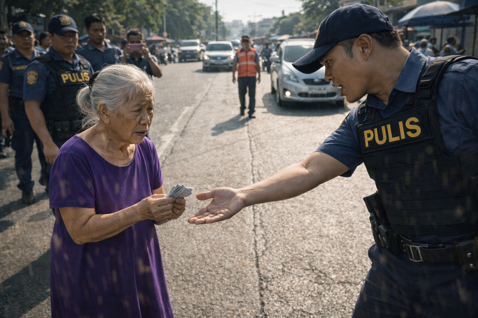 Inabot ni ate gina ang cellphone. Isang video: checkpoint, pulis na naka-vest, at isang matandang babaeng violet ang suot—si lola merce. Kita ang kamay na nanginginig, kita ang pag-abot ng pera, kita ang palad ng pulis na kumukuha.