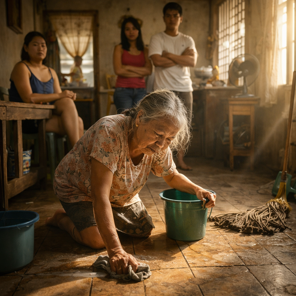 Pinipiga ng araw ang liwanag papasok sa lumang bintana habang si Aling Pilar, otsenta anyos, ay nakaluhod sa sahig na para bang siya pa rin ang pinakabata sa bahay. Mahigpit ang kapit niya sa basang pamunas, nanginginig ang kamay sa pagod, habang sa likuran ay nakatayo ang manugang at apo sa malalamig na tingin. Hindi na siya itinuturing na ina o lola—parang katulong na lang na walang sahod. Hindi nila alam, may batang nakakakita sa lahat… at may lakas ng loob na lumapit sa pulis.
