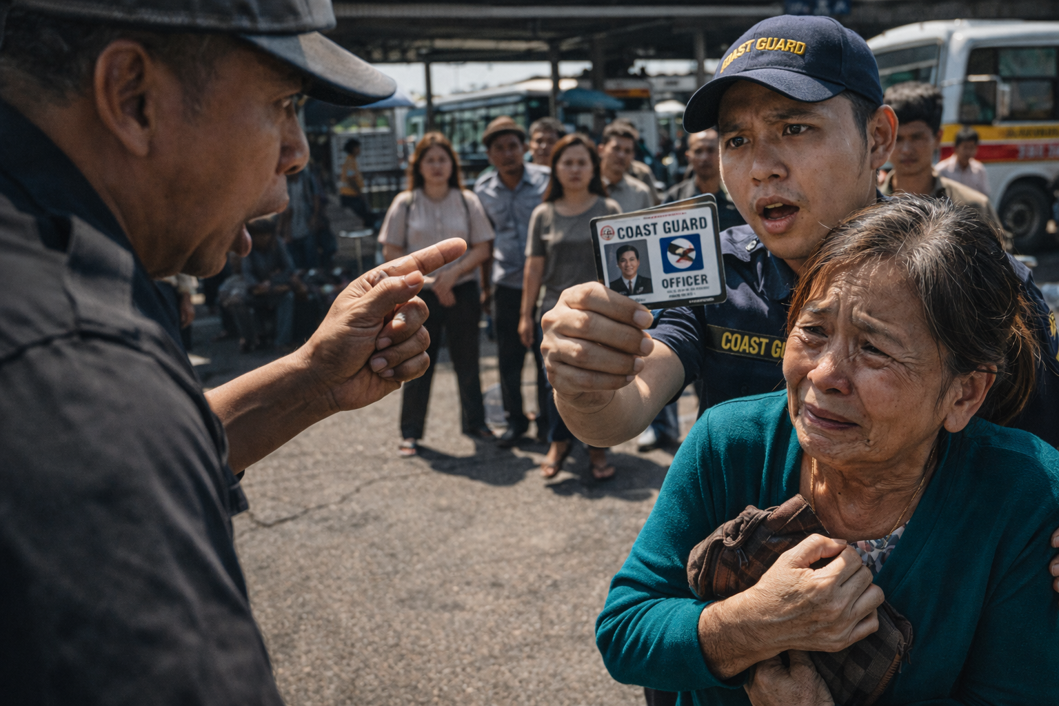 Sa dulo ng pila, may lalaking naka-uniporme, naka-cap na may nakasulat: COAST GUARD, at mabilis na papalapit—mata niyang puno ng pag-aalala.