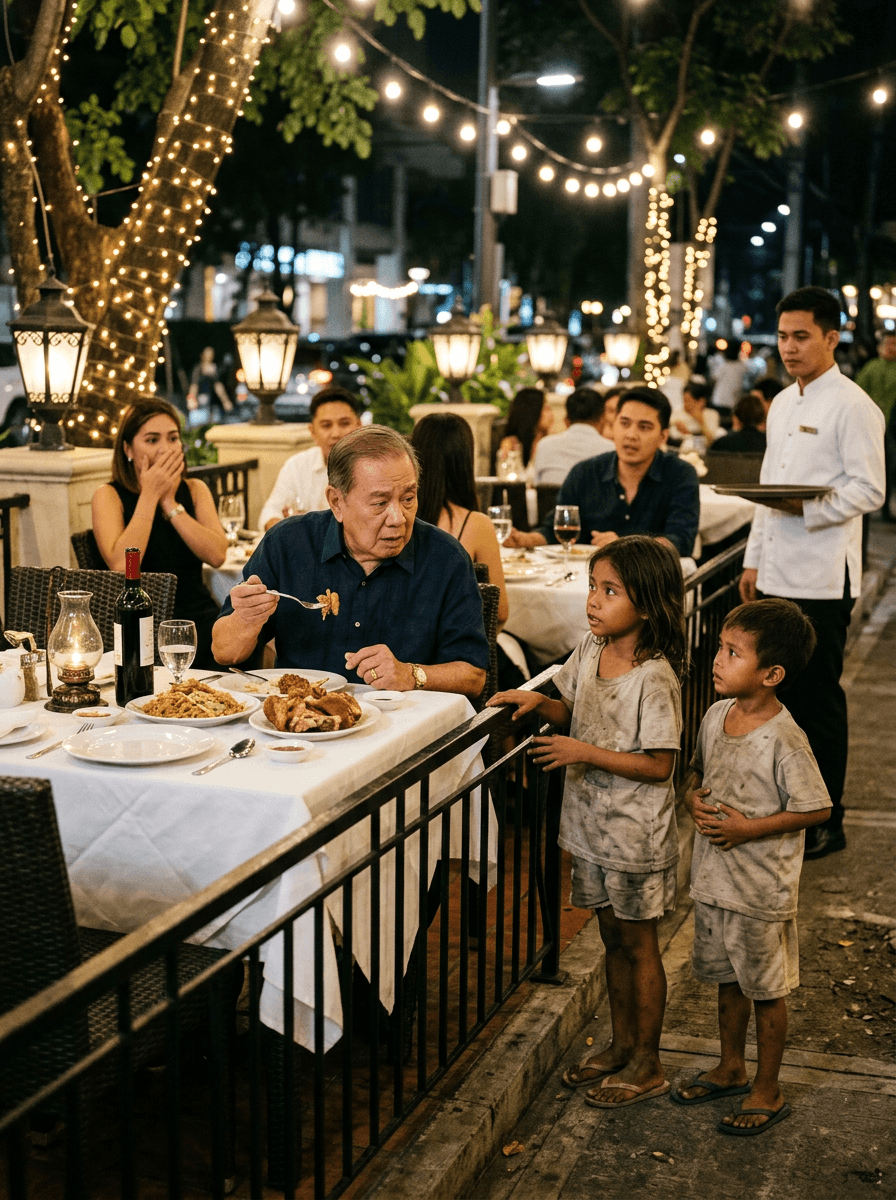 Maliwanag ang labas ng mamahaling restawran nang gabing iyon. Kumakaway ang mga ilaw na nakapulupot sa mga puno, tila ba pista ang buong kalsada. Sa bawat mesa ay may tawanan, lagukan ng alak, at tunog ng kubyertos sa mamahaling plato. Ngunit sa gilid ng bakal na harang, may dalawang batang halos matakpan na ng dilim—isang payat na batang babae at ang mas nakababatang kapatid niyang lalaki. Marumi ang kanilang damit, kupas ang tsinelas, at halatang ilang araw nang hindi nakakakain nang maayos.