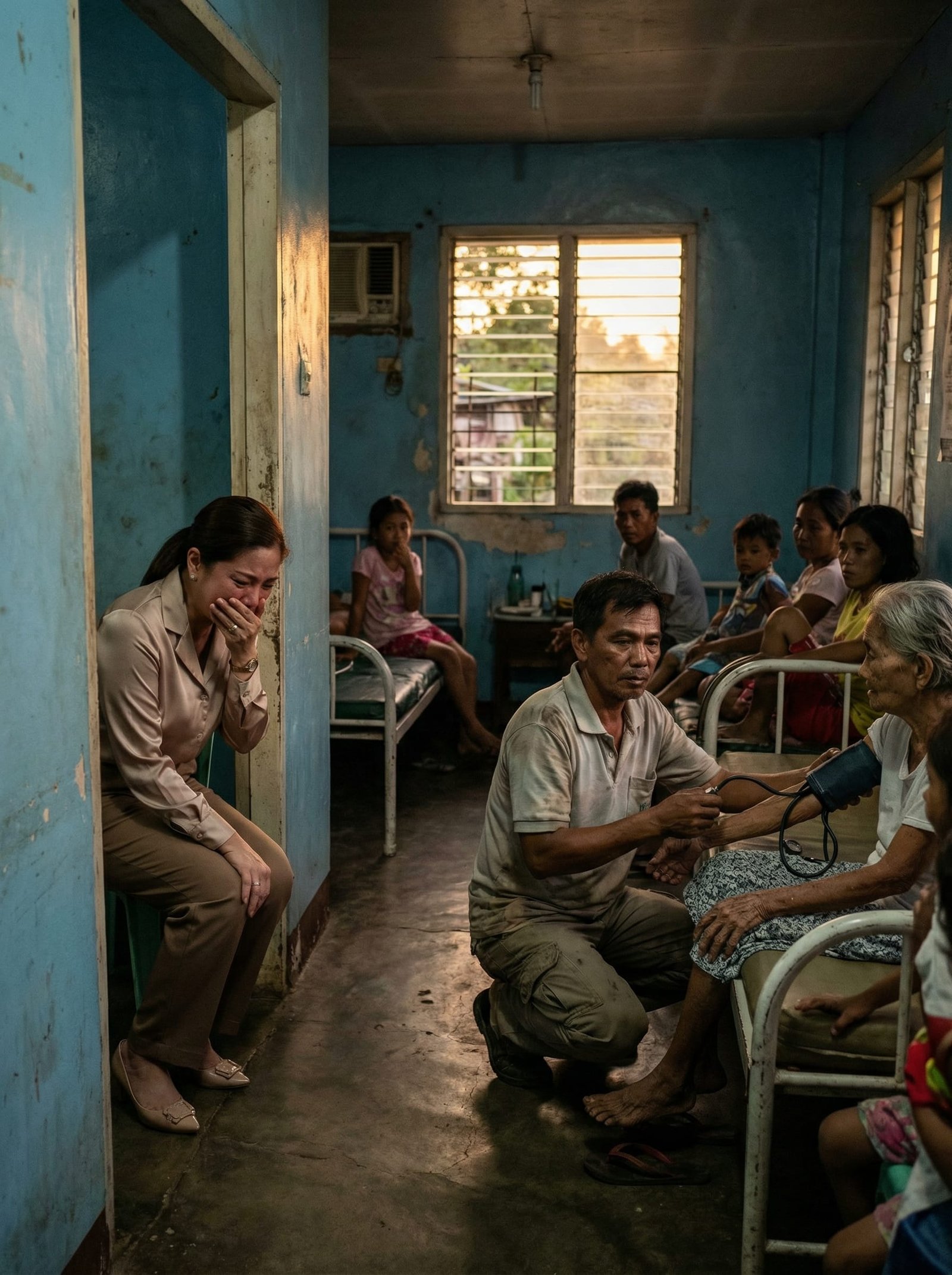 Sa gitna ng kahirapan, sa isang silid na halos walang maayos na kagamitan, nakita niya ang lalaking matagal niyang hinanap—nakaluhod sa harap ng isang matandang babae, maingat na sinusukat ang presyon nito, habang napapalibutan ng mga batang pasyente at pamilyang umaasa sa kanya.