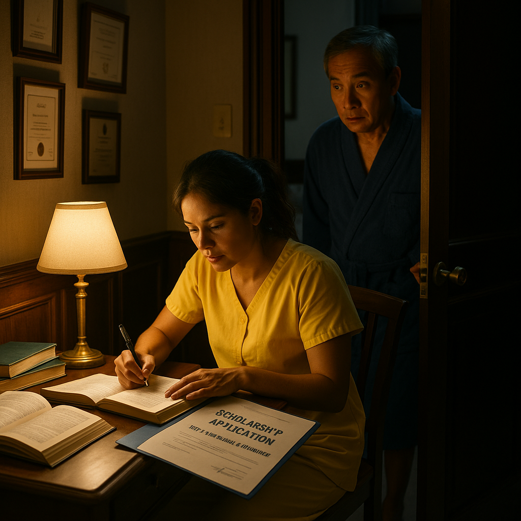 Alas-onse na pero buhay na buhay pa ang ilaw sa maliit na study table sa gilid ng lumang opisina. Doon nakaupo ang kasambaháy na si Mara, nakayukong sinusulatan ang isang pahinang naglalaman ng salitang halos hindi niya malunok: “SCHOLARSHIP APPLICATION.” Mahigpit ang hawak niya sa bolpen, parang kapag binitiwan ay maglalaho rin ang pangarap. Sa pinto, may mahinang kaluskos—si Alejandro Vergara, ang may-ari ng mansiyon, bagong dating galing sa business dinner, naka-bathrobe at tila napabalikwas dahil sa liwanag. “Anong ginagawa mo r’yan?” malamig na tanong ng milyonaryo, hindi pa man nakakalapit ay kita na ang pagdududa sa mata. Napalingon si Mara, bahagyang nabura ang tinta ng pawis sa talim ng ilaw. “Sir, pasensiya na po. Sandali na lang, isusuko ko na ‘to bukas sa foundation—” “Foundation?” napataas ang kilay ni Alejandro. “Sa oras na ‘to? Sa opisina ng namayapa kong asawa?” Napalunok si Mara. “Kailangan po ng tahimik na lugar. Huwag po kayong magagalit… scholarship lang po.”
