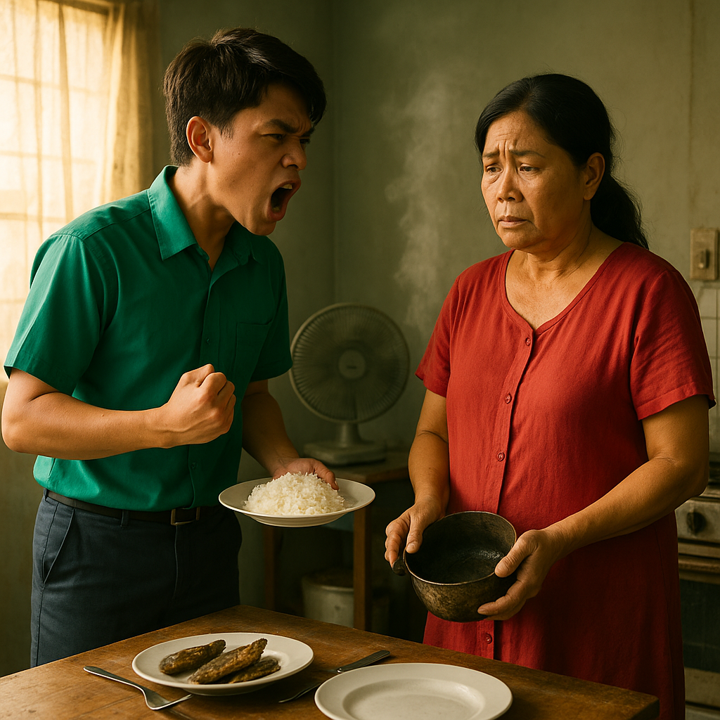 Sa lamesa, may tatlong pirasong pritong galunggong at isang kaserola ng kanin. Si Nanay, nakatayo sa kusina, hawak ang lumang sandok. “Anak, kumain ka na,” sabi niya, pagod ang boses pero may lambing. Umuusok pa ang sinaing—hindi usok ng kusang luto, kundi usok na nagbabadya ng pait.