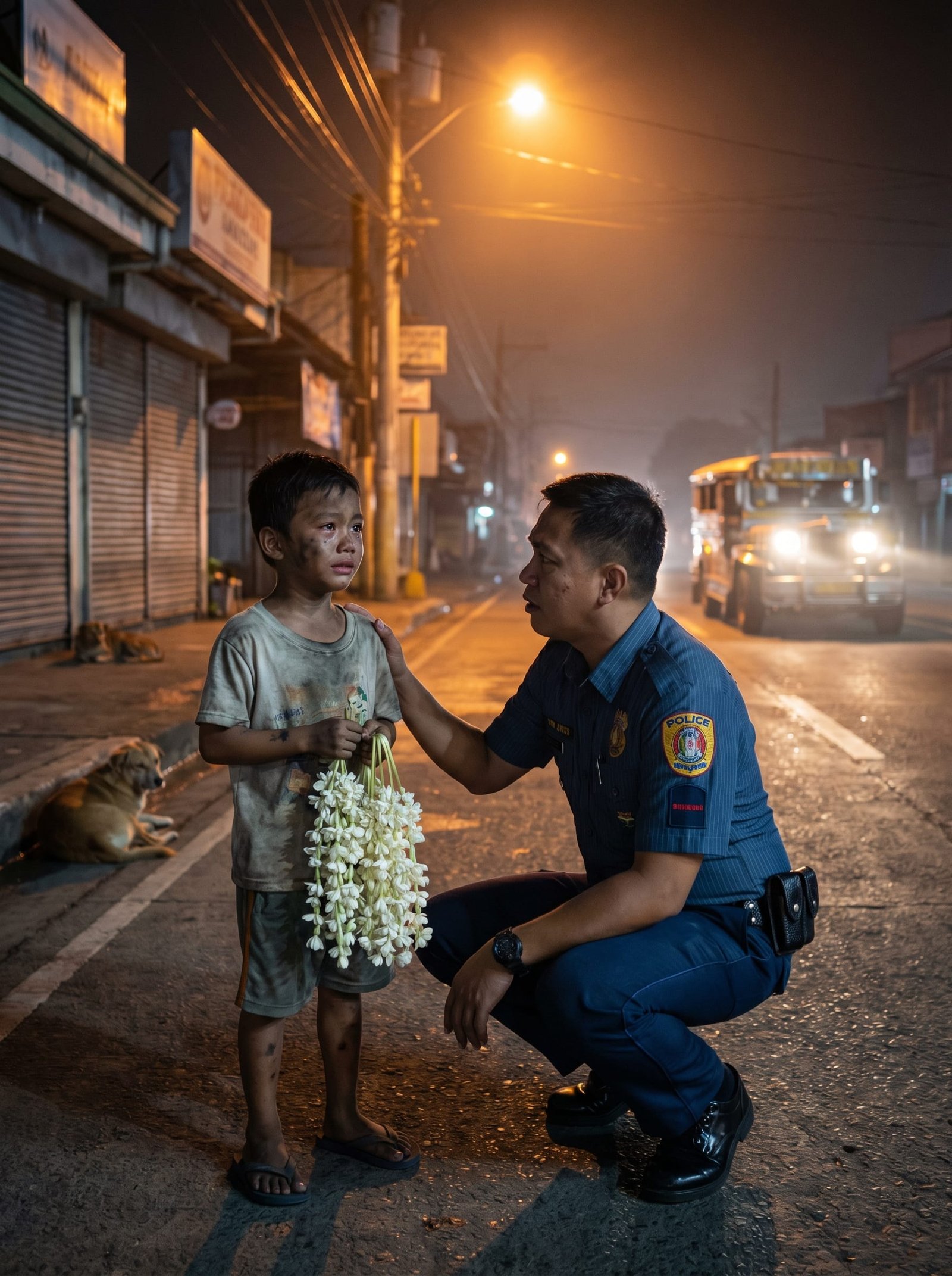 Hindi agad nakapagsalita si SPO2 Marco. Sa dami ng nakita niya sa trabaho—aksidente, away, pagnanakaw, pag-iyak ng mga naulila—akala niya sanay na ang puso niya sa mabibigat na tagpo. Pero iba ang tama ng isang batang dapat natutulog na, ngunit naroon sa kalsada at kumakapit sa kumpol ng sampaguita na para bang iyon ang huling pag-asa ng pamilya.