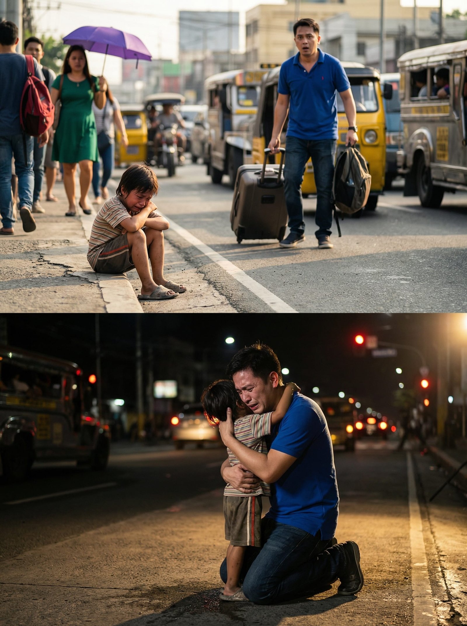 Habang hinihila niya ang maleta at bitbit ang backpack ng pasalubong, napansin niya ang isang maliit na batang nakaupo sa gilid ng sidewalk—yakap ang tuhod, marumi ang damit, may luha sa pisngi. Umiiyak ito nang tahimik, parang takot na mapansin.