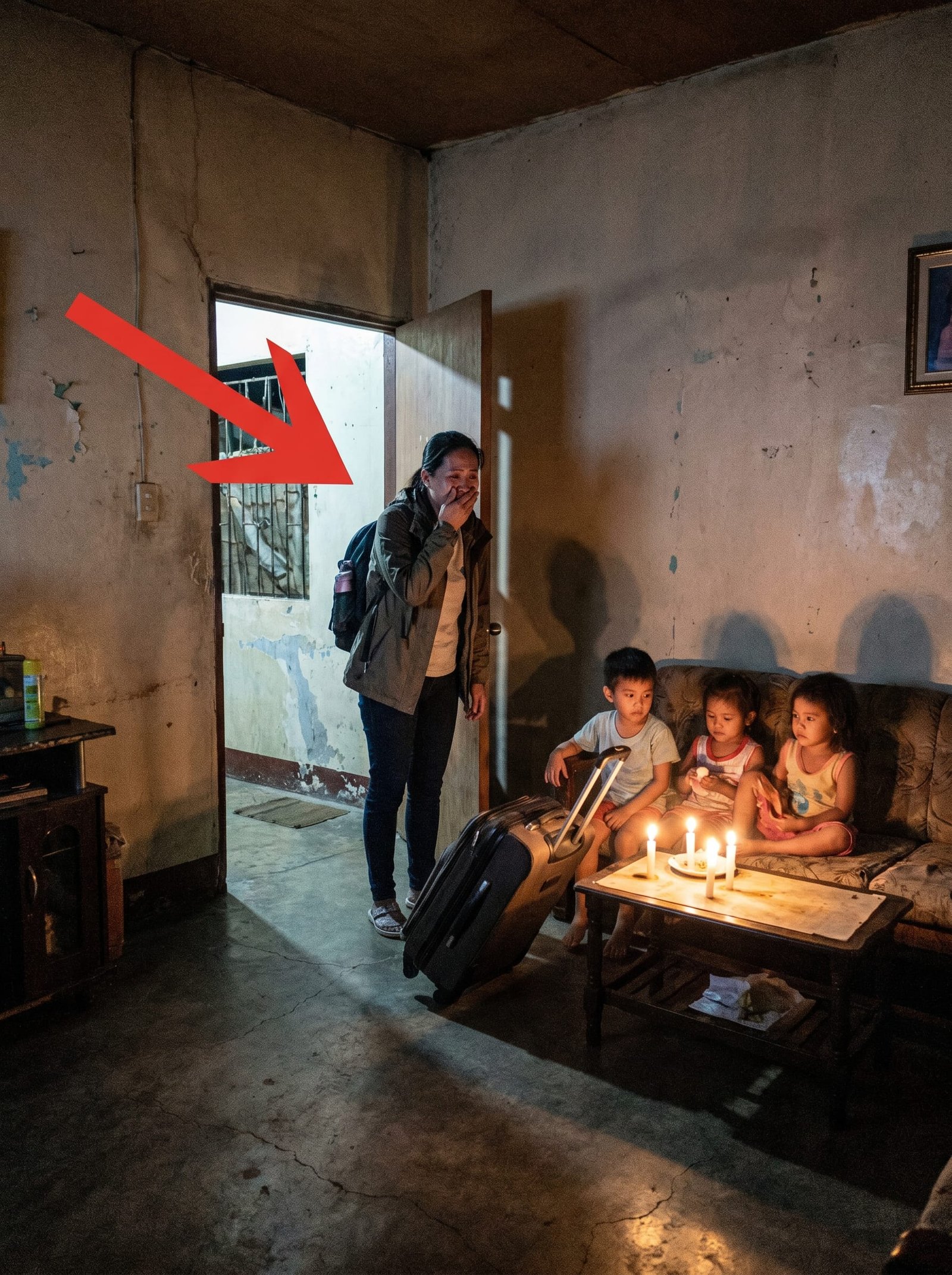 Madilim ang paligid. Walang bumbilyang nakasindi. Bukas ang pinto, at sa loob ay tatlong batang nakaupo sa lumang sofa, pinapaliwanag lamang ng kandila ang kanilang mga mukha. Tahimik ang mga ito, hawak ang tig-iisang pirasong tinapay. Nang makita siya ni Paolo, napatayo ito. “Mama?”