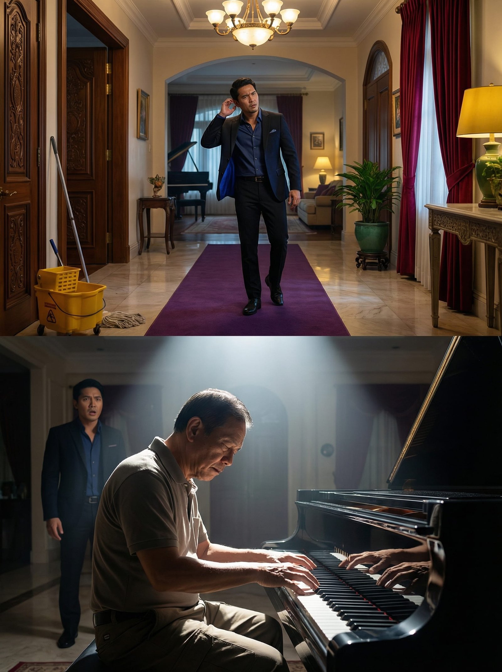 Nakatayo si Don Adrian sa sala. Nasa likod niya si Mang Isko, tahimik, nanginginig, parang takot mawalan ng tahanan. Sa gilid, ang grand piano—ang naging tulay ng katotohanan.