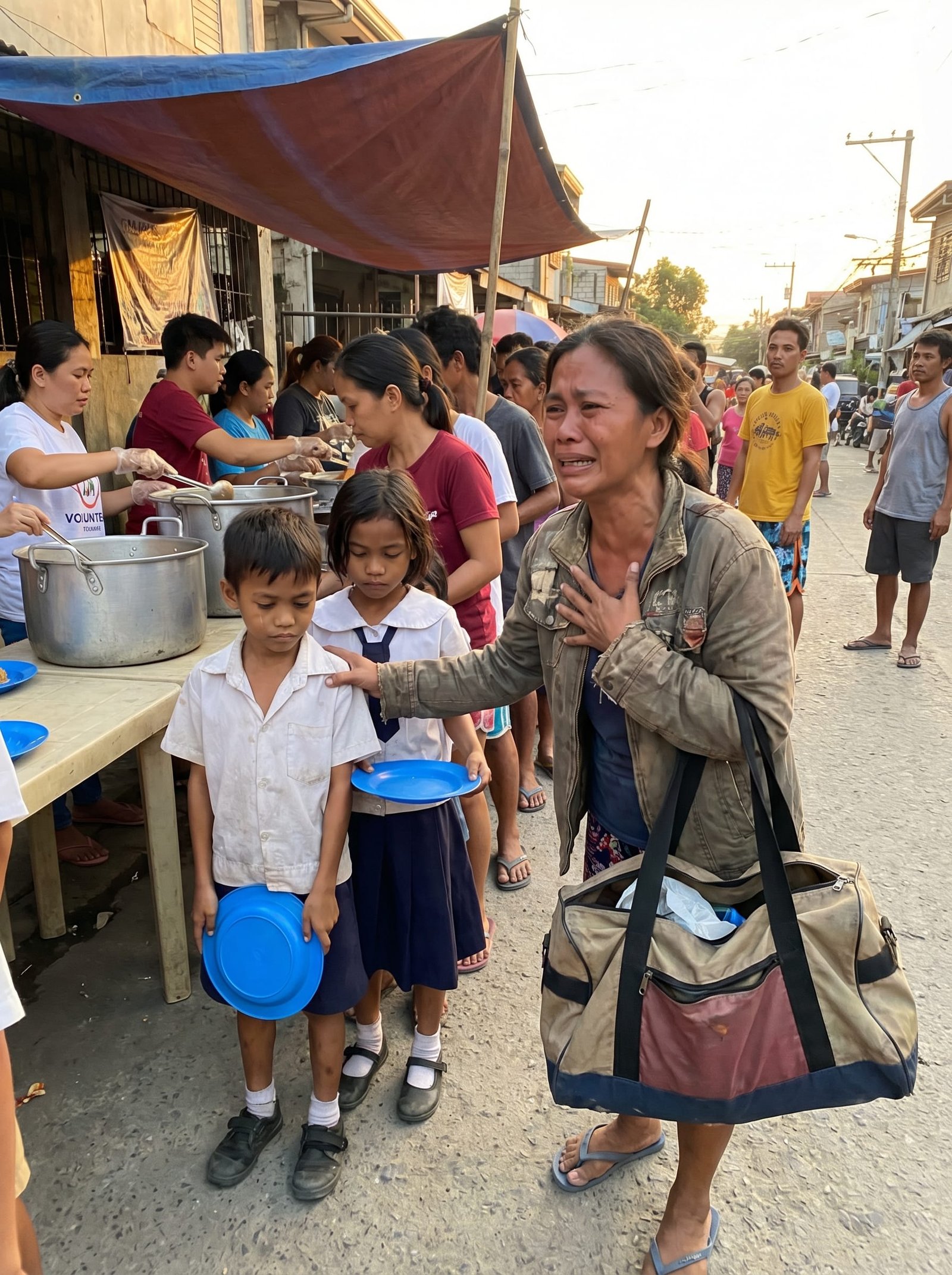 Pagdating niya sa dulo ng eskinita, nakita niya ang mahabang pila. May mga volunteer na nagsasandok ng lugaw. At sa gitna ng mga batang may hawak na plastik na plato, naroon sina Paolo at Mika—naka-uniporme, nakayuko, at halatang gutom.