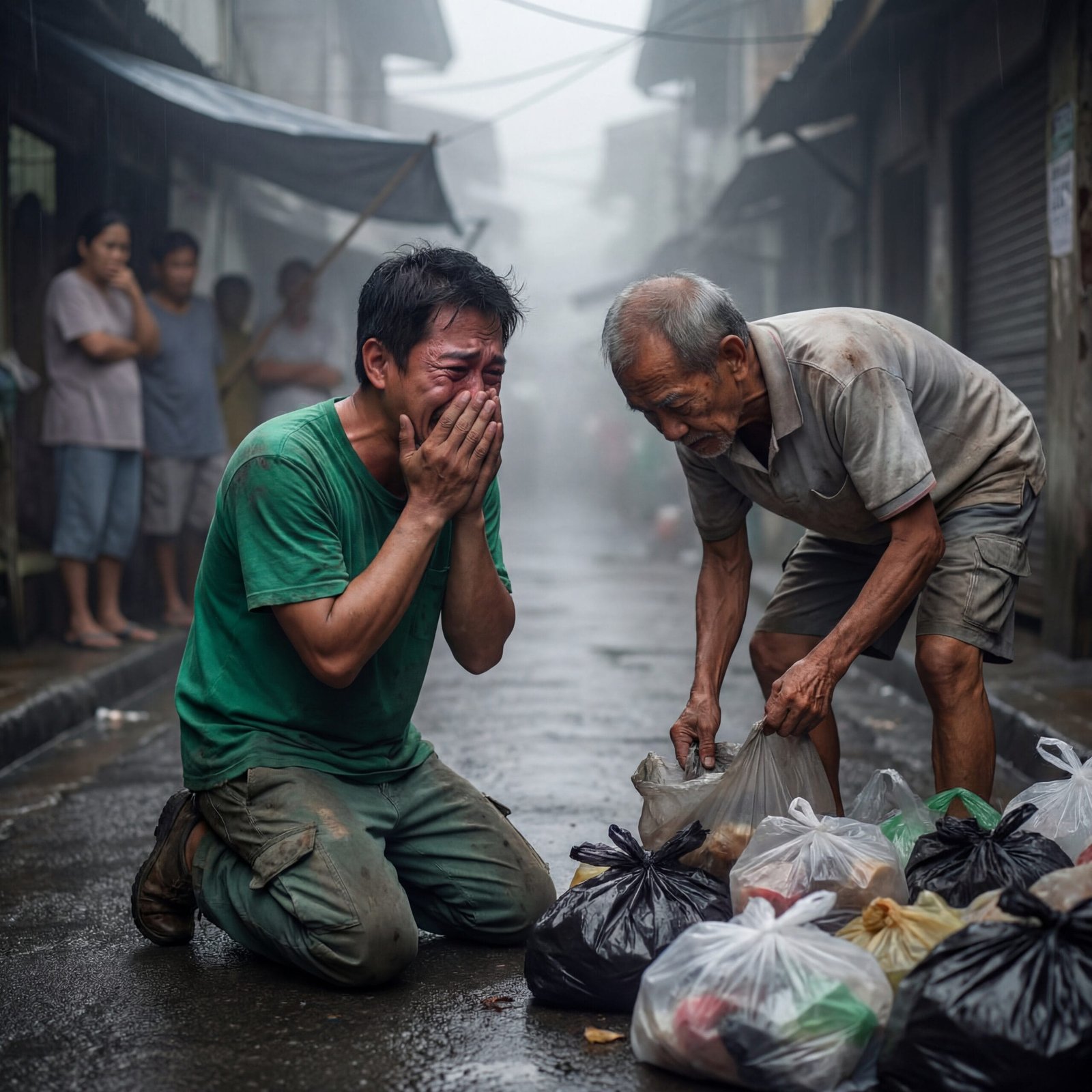 Hindi na nakapagsalita si Marco. Tinakpan niya ang bibig niya, pinipigil ang hikbi, habang ang ulan ay pumapatak sa kanyang mga luha—parang gustong itago ng langit ang kanyang kahihiyan.