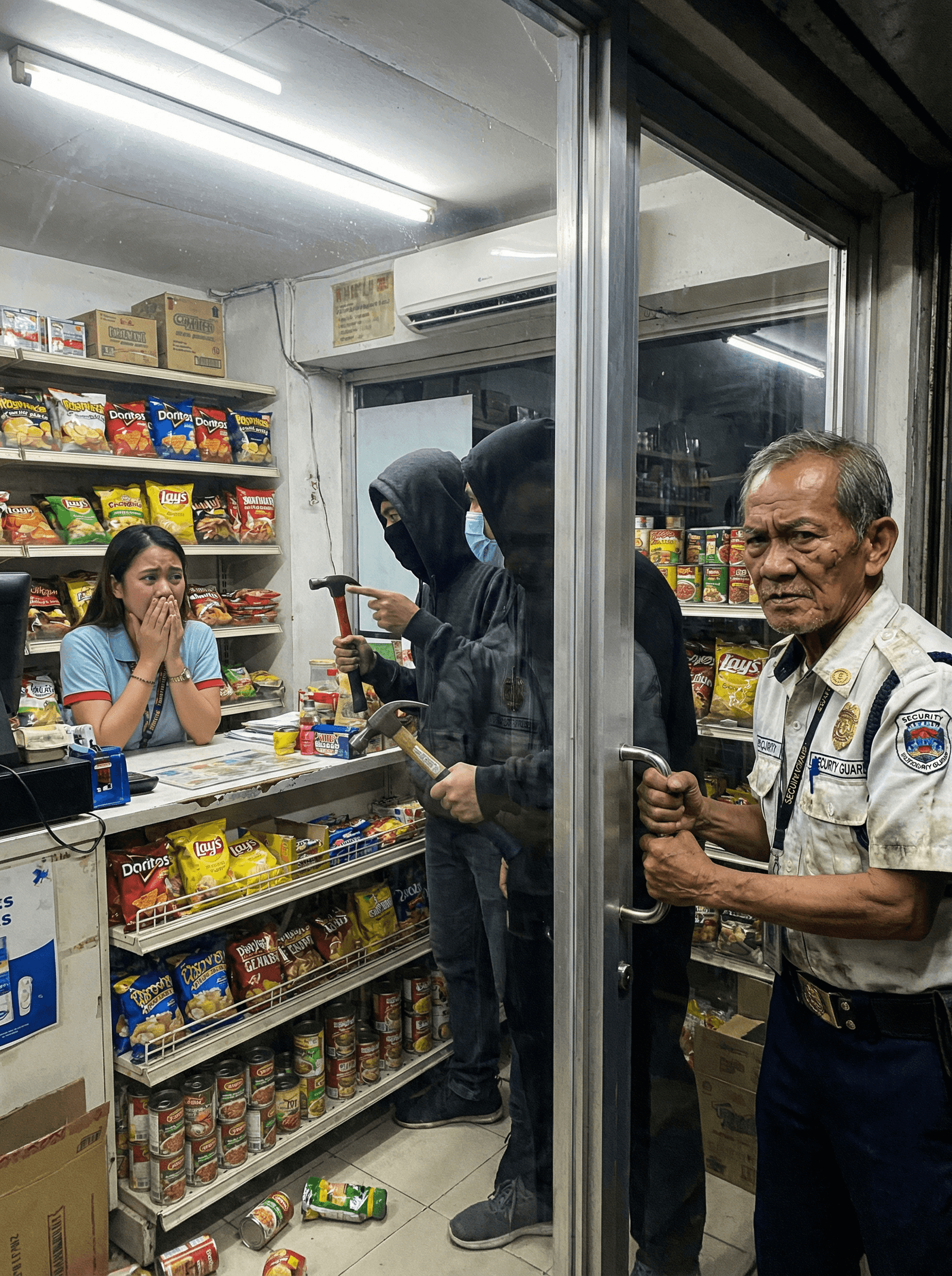 “Buksan mo!” sigaw ng lalaking may martilyo habang paulit-ulit na ipinupukpok ang bakal sa gilid ng counter. Bawat hampas ay dumadagundong sa buong tindahan. Ang dalawang kasama nito ay mabilis nang nagsalansan ng sigarilyo, chocolates, at perang nasa kahera sa isang itim na bag. Nanginginig si Ella habang sinusubukang pindutin ang code ng kaha. Halos hindi niya maramdaman ang mga daliri niya.