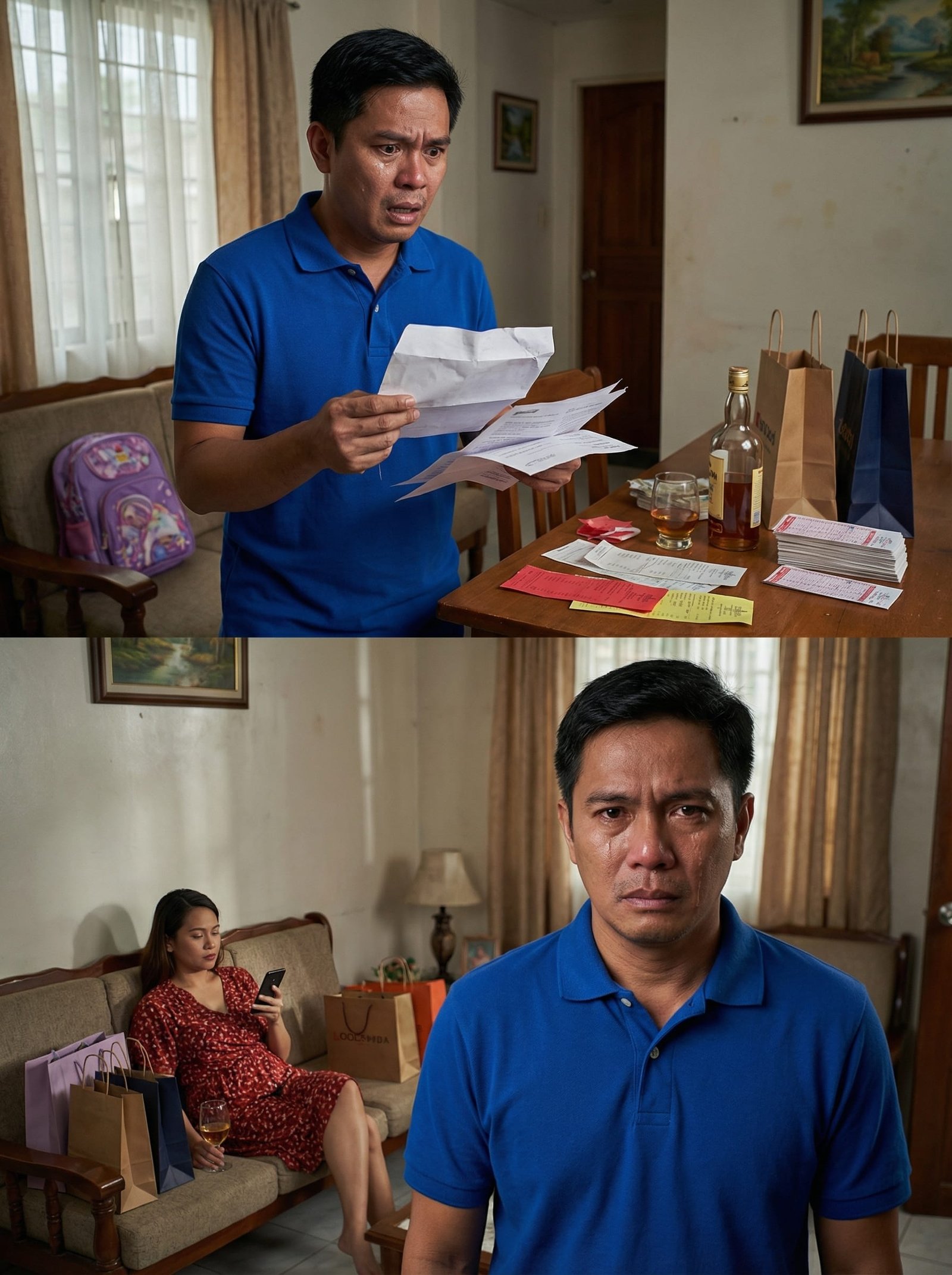 Lumabas mula sa sala ang asawa niyang si Mara—nakapulang damit, hawak ang cellphone, at may shopping bags sa tabi ng sofa. Hindi man lang nagulat sa pag-uwi niya, parang alam na niyang mahuhuli.