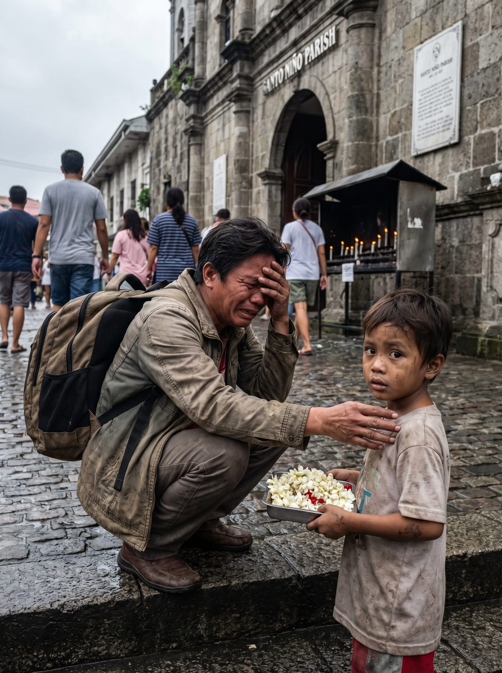 Ngunit pagdating niya sa gilid ng gate, may isang batang marumi ang damit, hawak ang lalagyan ng sampaguita, at paikot-ikot sa mga deboto.