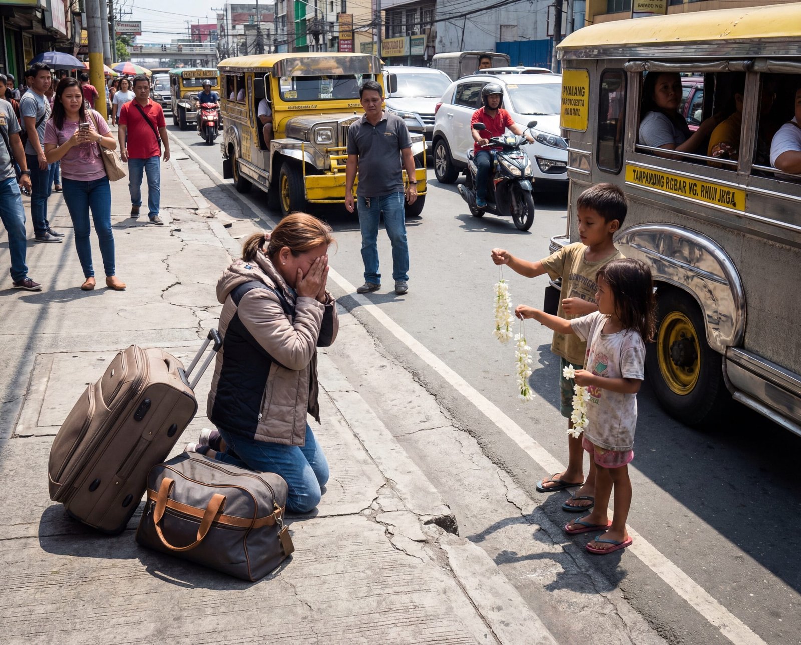 Hindi agad siya napansin ng mga bata. Abala si Josh sa pag-abot ng sampaguita sa isang pasaherong bumukas ang bintana ng jeep. Si Lia naman, nakatayo sa init, nakapulupot ang buhok, may bahid ng alikabok sa pisngi. Pareho silang payat—mas payat kaysa sa huling video call. Mas matanda rin ang tingin sa mata, parang sa murang edad, may alam na silang hindi dapat alam ng bata.