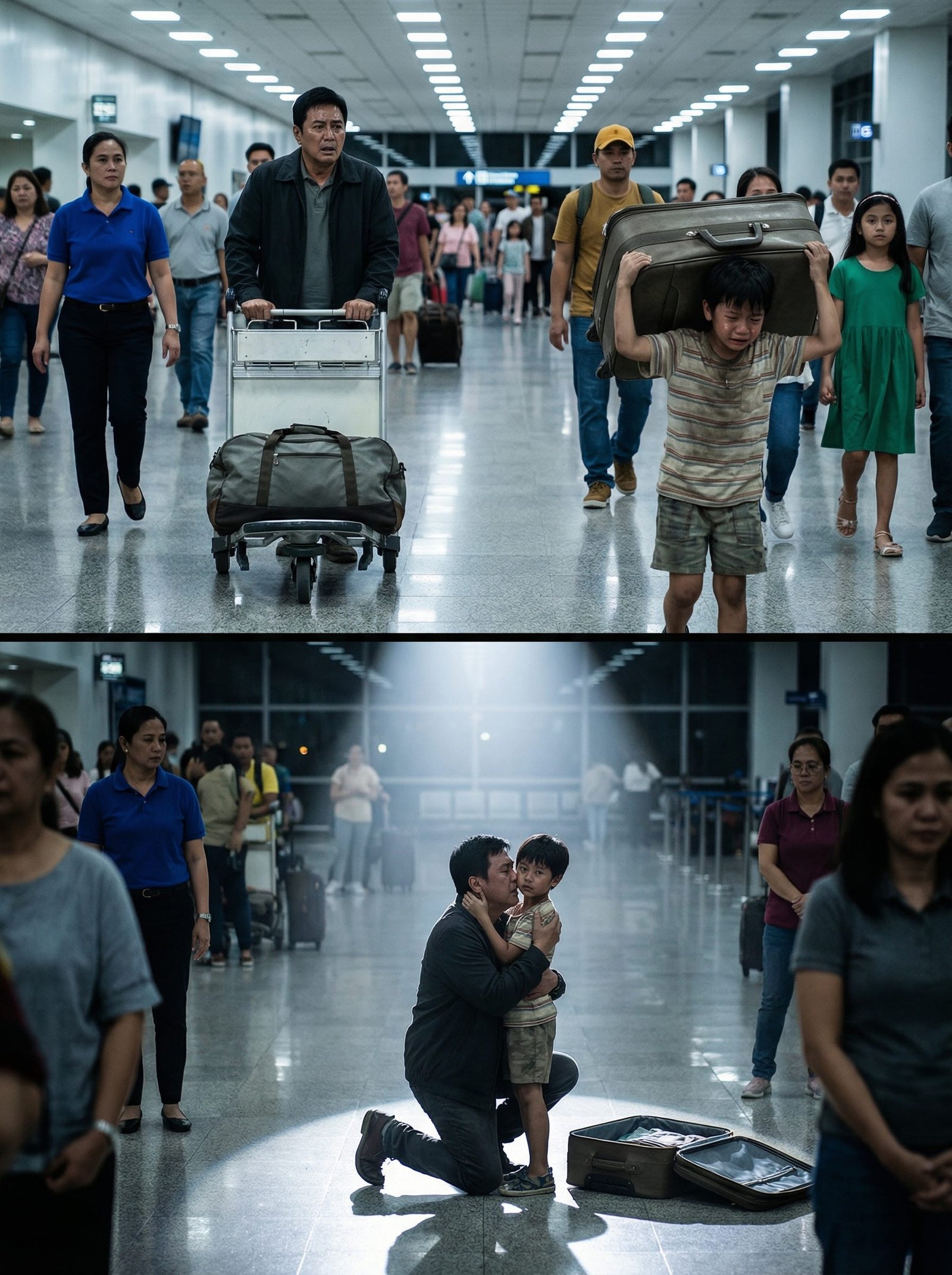 Terminal ang bungad: mahabang pasilyo, amoy kape, tunog ng gulong ng maleta, at mga taong nagmamadali. Sa gitna ng lahat, may batang lalaki na halos mabali ang likod sa bigat ng isang malaking maleta. Umiiyak ito habang pilit binubuhat ang bagahe sa ulo, nakasiksik ang strap sa balikat.