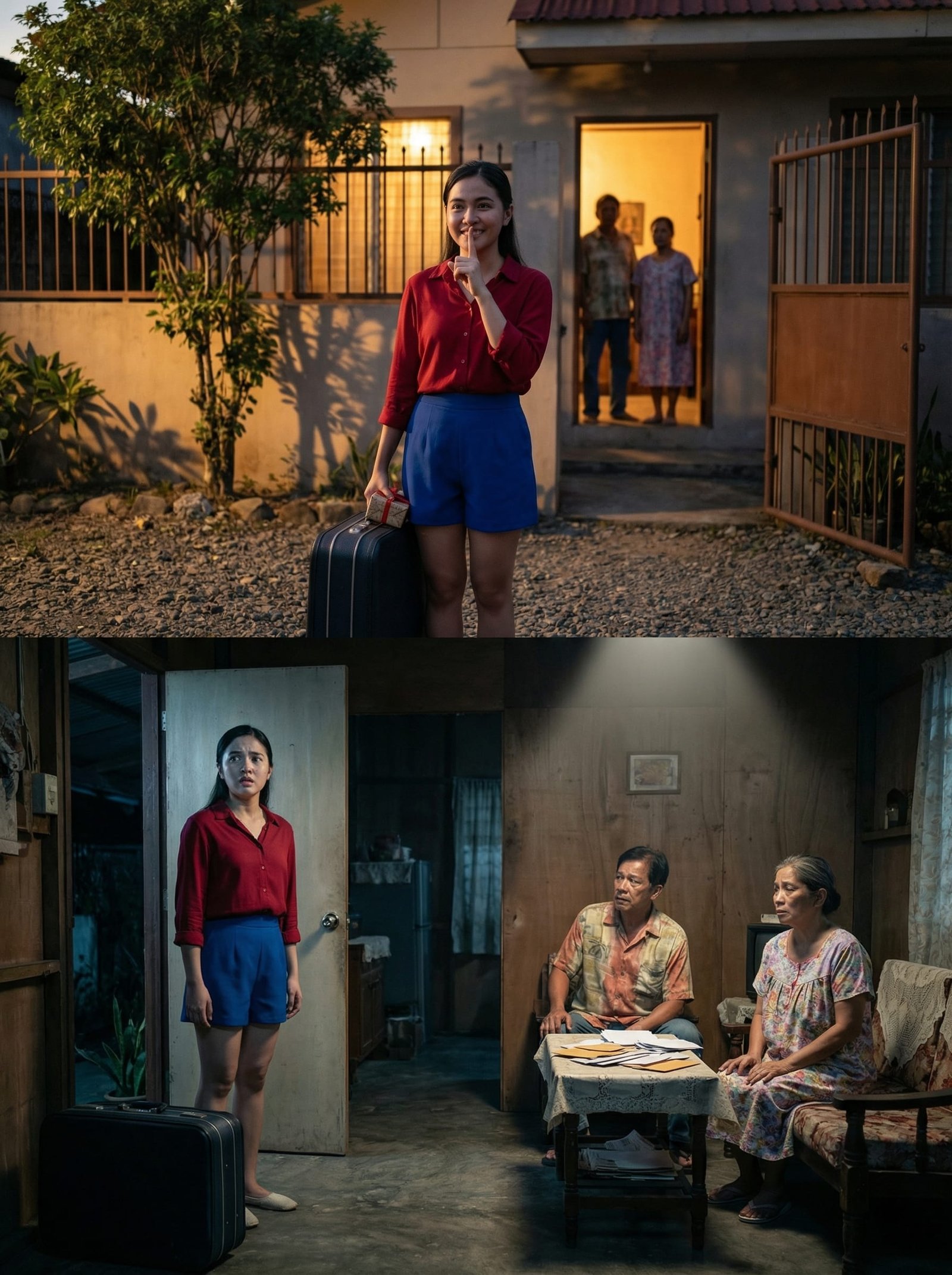 Bitbit niya ang maliit na maleta at pasalubong na maingat na binalot. Nakangiti siya habang dahan-dahang nilalakad ang mabatong bakuran. Sa gate, huminga siya nang malalim, tapos itinaas ang daliri sa labi, parang bata: “Shhh.”
