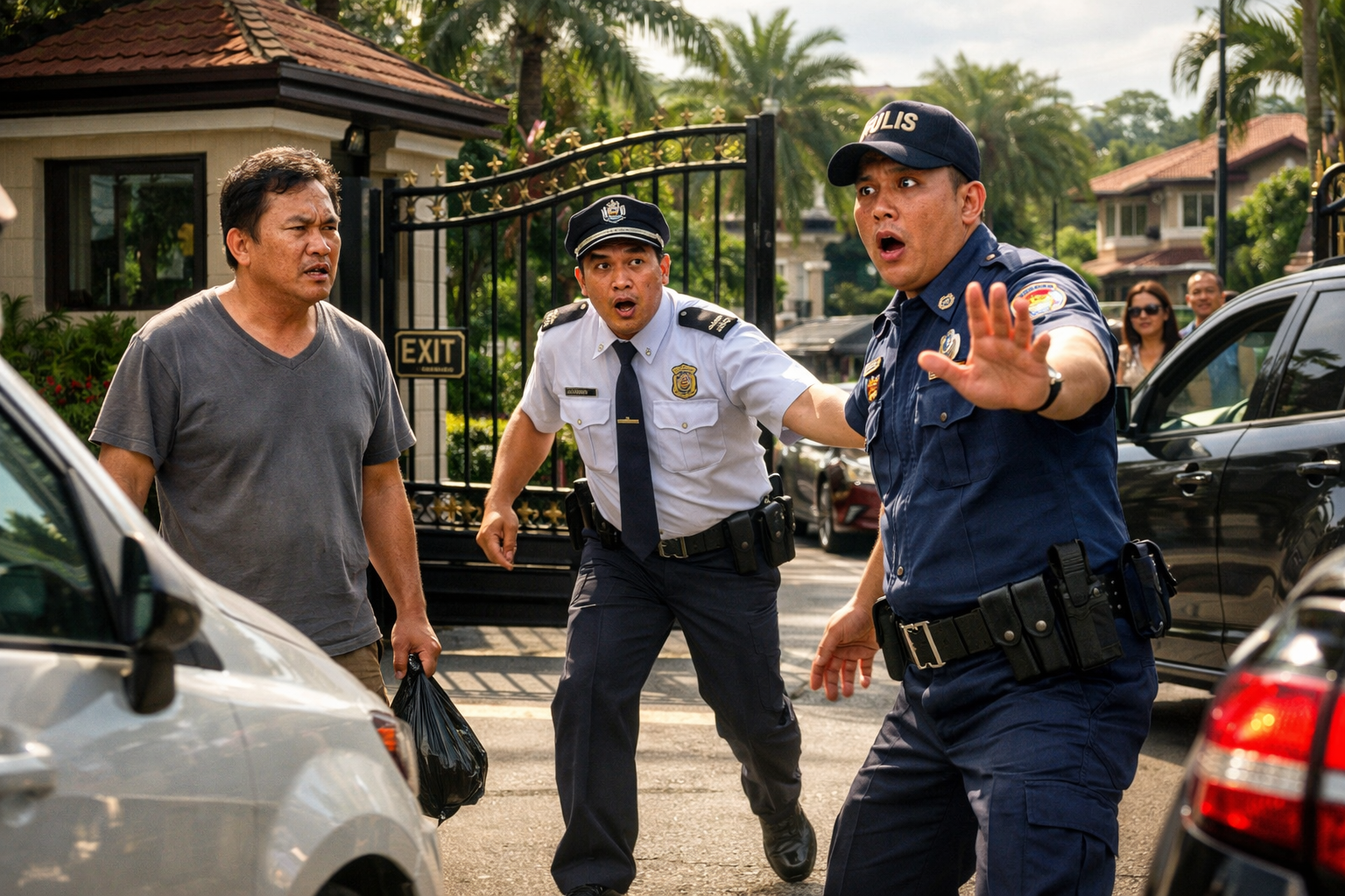 May ilang nakatayo sa loob ng gate, mga guard na nakatingin lang. May isang traffic enforcer sa gilid, abala. At sa malayo, may dalawang babaeng dumaan, halatang narinig ang sigawan, at parang nagtataka kung ano ang kasalanan ng lalaking naka-gray.