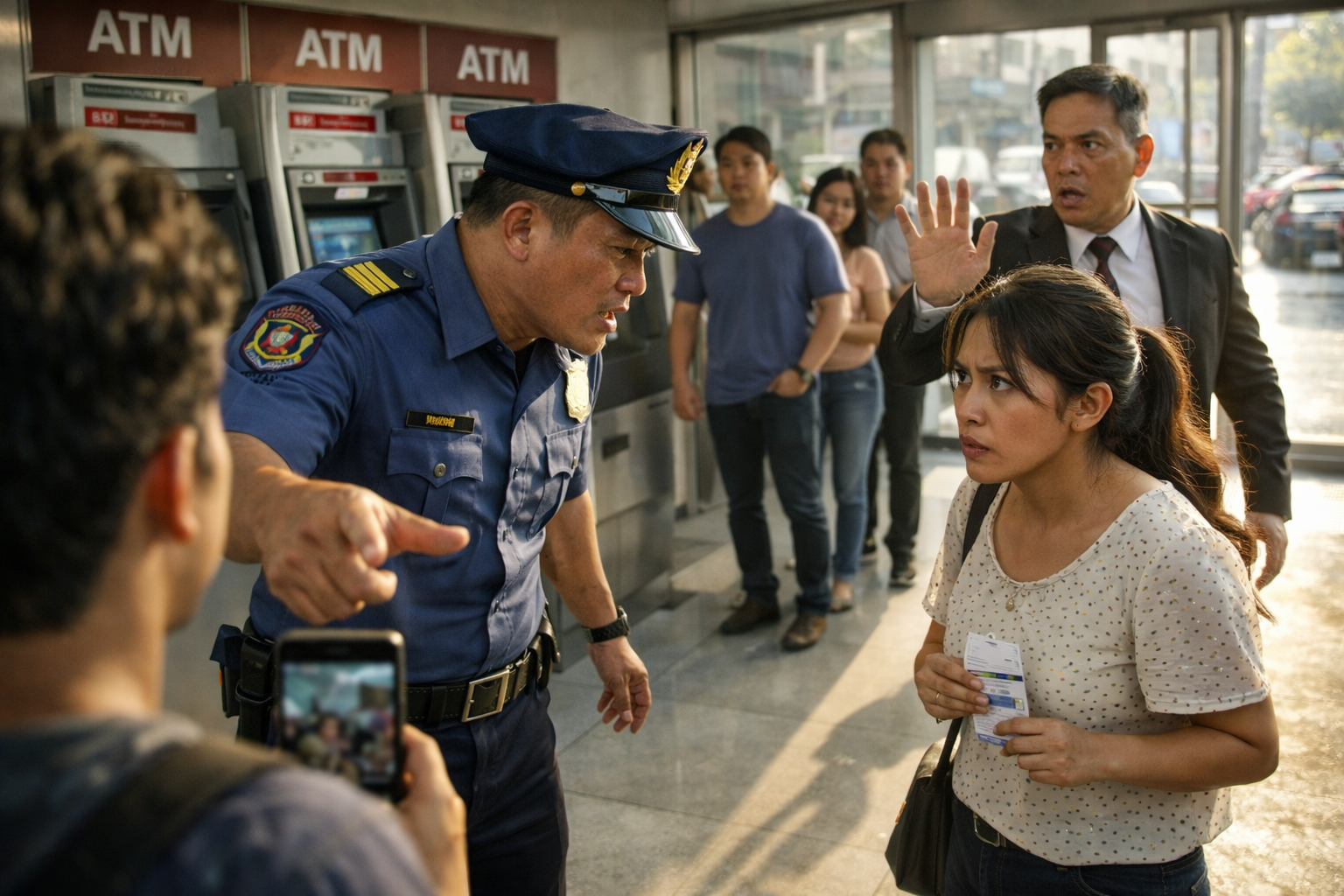 Nang malapit na siya sa ATM, biglang may umalingawngaw na boses. “Ikaw! Oo ikaw, babae!” Sigaw iyon ng pulis na nakapwesto sa lobby, si Sgt. Dela Cruz. Matikas ang tindig, nakasapatos na makintab, at may tingin na parang lahat ay may kasalanan.