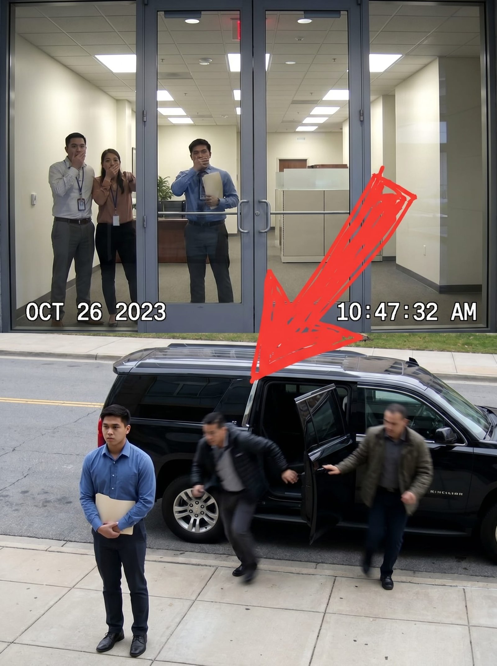 Eksaktong alas-diyes kuwarenta’y pitong minuto nang marinig ang tunog ng isang sasakyang humihinto sa tapat ng gusali. Napatingin ang lahat. Isang itim na SUV ang marahang umatras at tumapat sa mismong entrance. Agad nagkagulo ang lobby. Tumayo ang receptionist. Napasigaw ang HR assistant. Maging ang guard ay biglang nagtuwid ng tayo.
