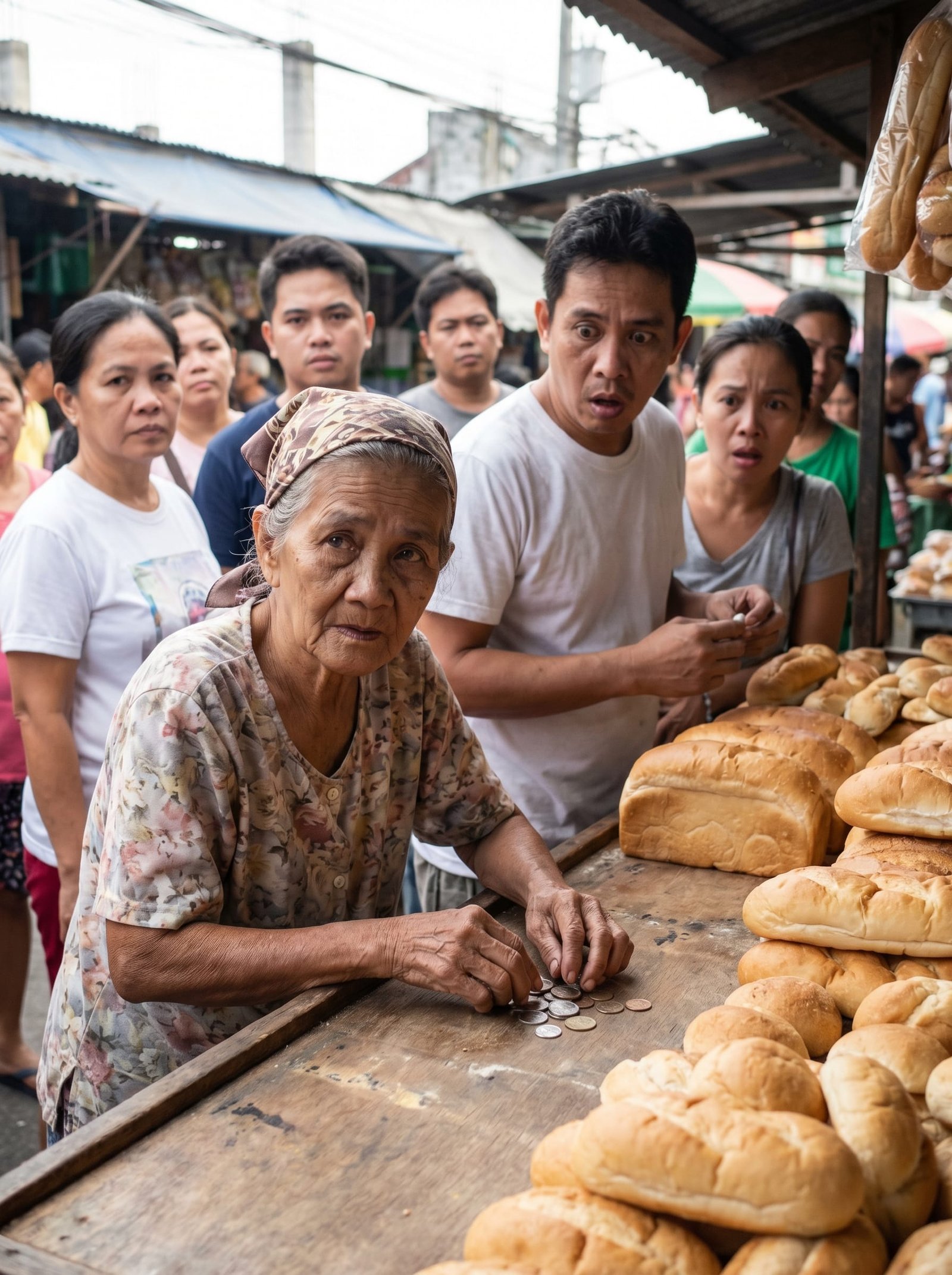 Maaga pa lang ay magulo na ang palengke. Sigaw ng mga mamimili, tawaran sa gulay, kalansing ng traysikel, at amoy ng bagong lutong pandesal ang sumalubong sa lahat. Sa gitna ng ingay, dahan-dahang lumapit sa puwesto ng tinapay si Aling Sioning, isang matandang babae na may kupas na damit, manipis na panyo sa ulo, at mga matang halatang puyat at gutom.