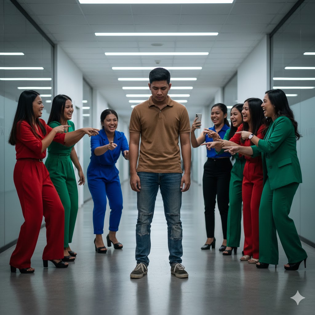 “Hala, girl, i-video mo,” sabi naman ng naka-asul na slacks, sabay taas ng telepono. Pumailanlang ang hagikhik—mabilis, pino, kagat-labi na parang pati hiya nila ay kinain ng tawa. Sa isang iglap, naging entablado ang pasilyo; nasa gitna si Jiro, pinagbabaril ng tingin, kinukunan ng kuha na hindi niya hiningi.