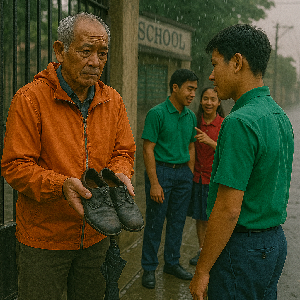 Ako si Neo, Grade 10. Umuulan noon, at ang gate ng eskwela amoy bakal at putik. Naka-green akong polo, nagtatakip ng bag para hindi mabasa ang module. Sa gilid, nagtitili ang mga kaklase—may sumisigaw, may nagtatawanan, may nagvi-video pa. Sa gitna ng kulo, sumulpot si Tatay, suot ang lumang jacket na kahel at may hawak na payong. Nakalantad sa dalawang kamay niya ang itim na sapatos—gasgas ang dulo, halatang maraming dinaanan. “Anak,” tawag niya, hinihingal, “na-iwan mo ‘yung sapatos mo sa bahay. Bawal daw rubber shoes sa exam.” Hindi ko napansin na nakatingin ang mga nasa likod ko. “Uy, sapatos ng lolo!” bulong ng isa. “Pre, parang helm ng barko—puro butas!” tawa naman ng isa pa.